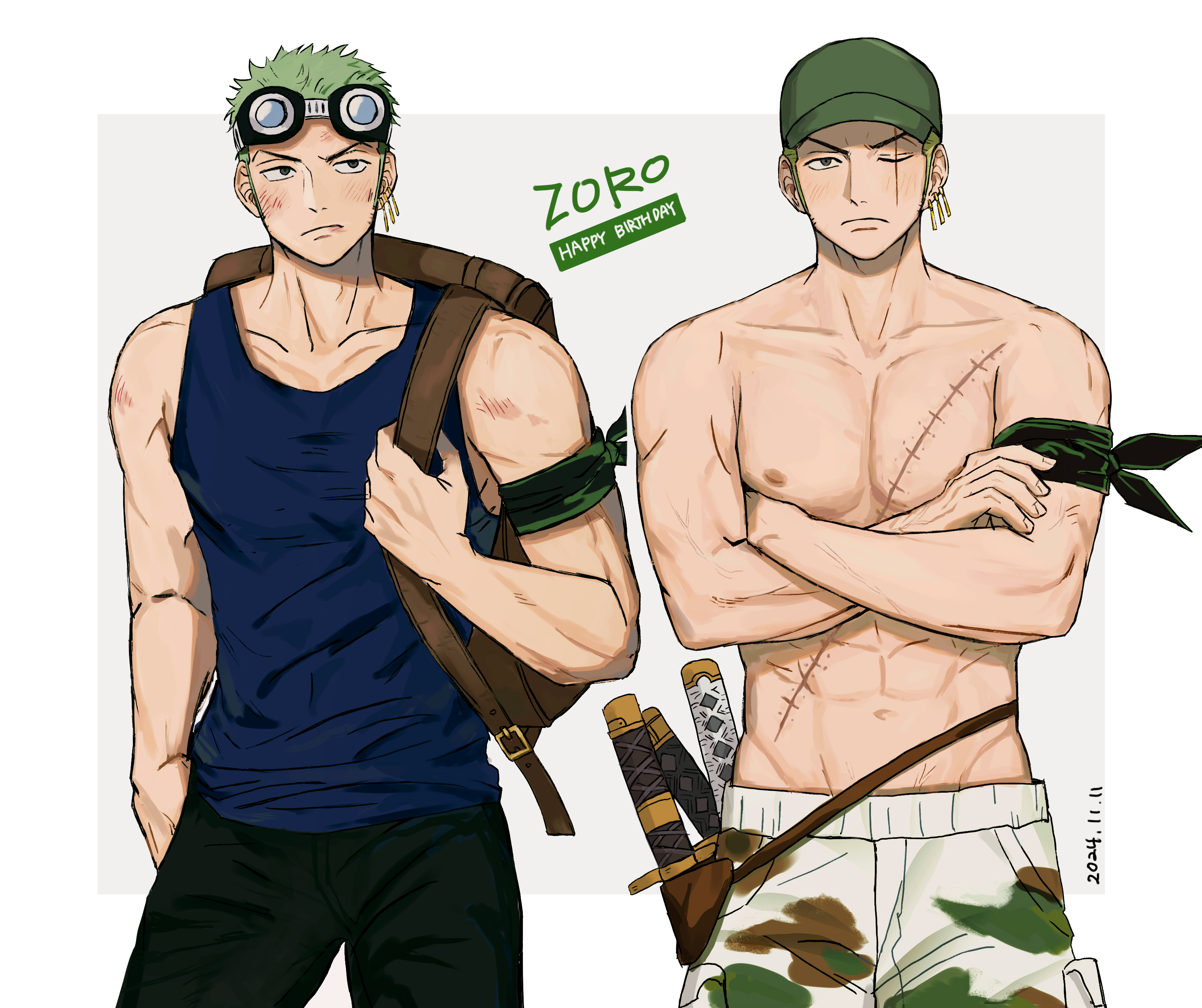 1boy abs absurdres bag blue_tank_top blush character_name closed_mouth commentary_request crossed_arms dated earrings goggles goggles_on_head green_hair green_hat hand_in_pocket happy_birthday hat highres jewelry jjerri00 korean_commentary looking_at_viewer looking_to_the_side male_focus multiple_views one_piece pale_skin roronoa_zoro scar scar_across_eye scar_on_face shorts shoulder_bag simple_background stitched_torso stitches tank_top topless_male