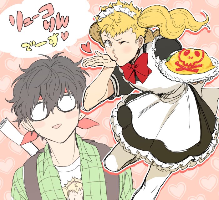 2boys amamiya_ren apron arm_up back_bow backpack bag black-framed_eyewear black_hair blowing_kiss blush bow collared_shirt commentary_request crossdressing crossdressing_(mtf) dress food frilled_apron frilled_dress frills glasses green_shirt hair_between_eyes headband heart holding holding_plate ketchup looking_to_the_side maid maid_apron maid_headdress male_focus male_maid multiple_boys omelet omurice one_eye_closed open_clothes open_shirt pantyhose patterned_clothing persona persona_5 plate red_bow red_headband sakamoto_ryuuji shirt short_sleeves skull_and_crossbones standing standing_on_one_leg triangle_mouth tsugu_106 twintails wavy_hair white_apron white_bow white_pantyhose wing_collar yaoi