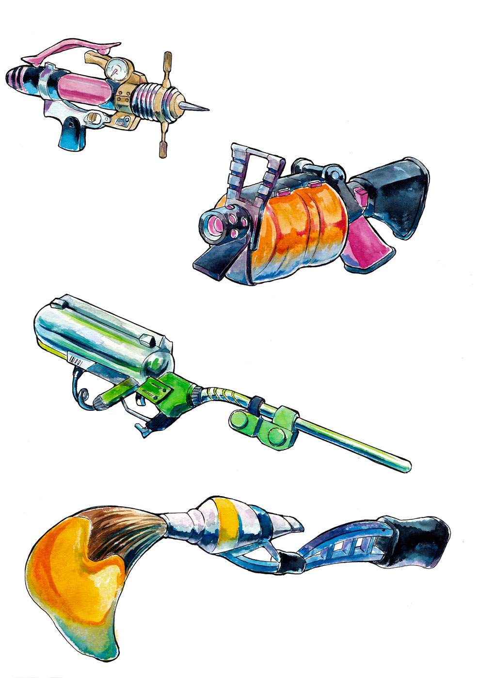 .52_gal_(splatoon) commentary_request e-liter_3k_(splatoon) highres inkbrush_(splatoon) nintendo no_humans simple_background splash-o-matic_(splatoon) splatoon_(series) splatoon_1 still_life traditional_media uchiyama_(uuchiyamaa) weapon_focus white_background
