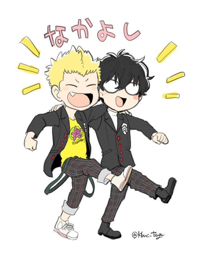 2boys amamiya_ren arm_around_shoulder arm_up black-framed_eyewear black_footwear black_hair black_jacket buttons clenched_hand closed_eyes commentary_request crew_neck fang glasses hair_between_eyes jacket lapels long_sleeves male_focus multiple_boys open_clothes open_jacket open_mouth pants persona persona_5 plaid_clothes plaid_pants print_shirt sakamoto_ryuuji school_uniform shirt shoelaces short_hair shuuchiin_academy_school_uniform side-by-side standing standing_on_one_leg t-shirt tongue translation_request triangle_mouth tsugu_106 turtleneck twitter_username v-shaped_eyebrows very_short_hair white_background white_footwear white_shirt yellow_shirt