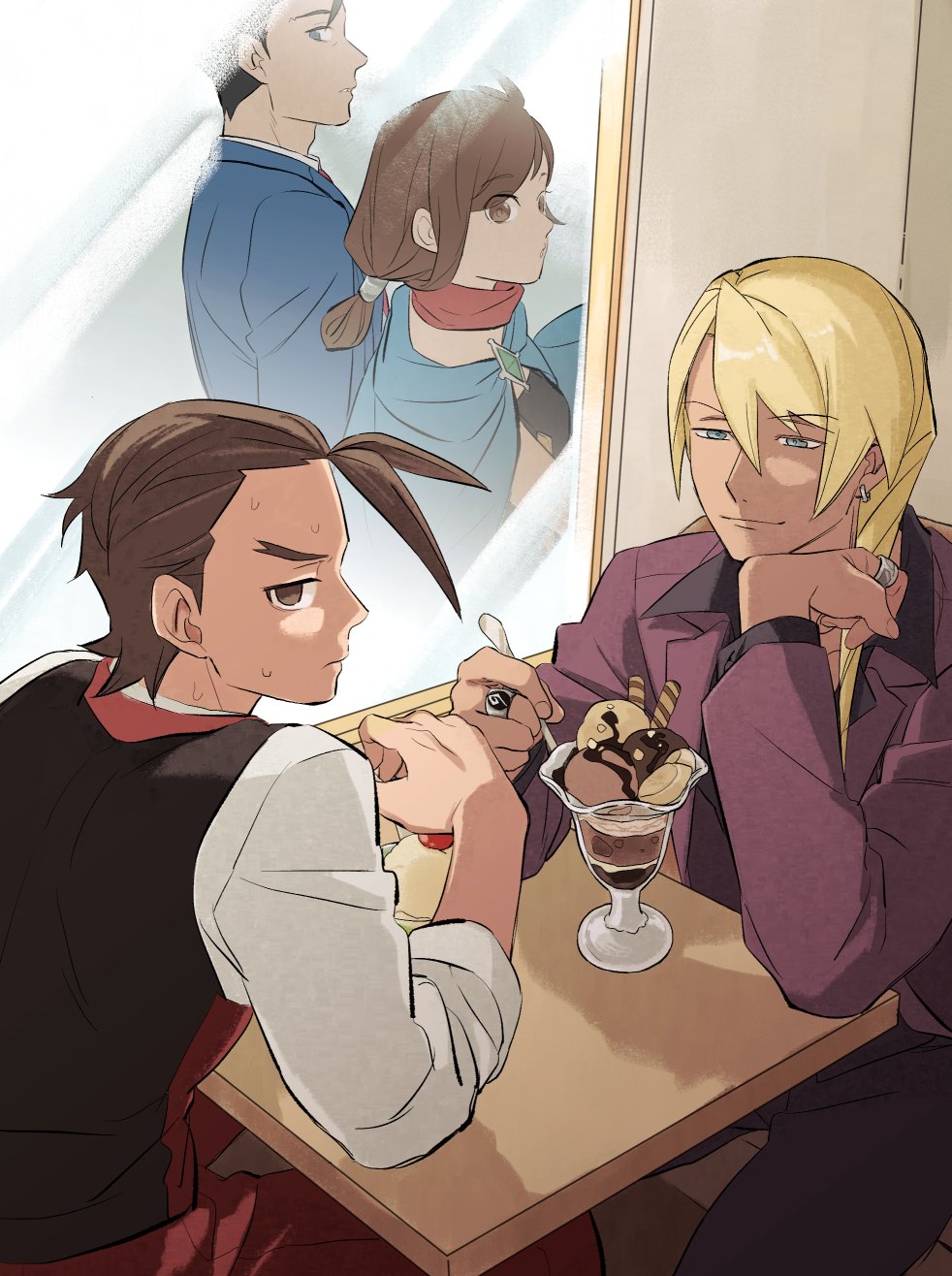 1girl 3boys ace_attorney apollo_justice apollo_justice:_ace_attorney blonde_hair blue_cape blue_eyes blue_jacket booth_seating brown_eyes brown_hair cape drill_hair earrings elbow_on_table food forked_eyebrows highres holding holding_spoon ice_cream jacket jewelry klavier_gavin looking_at_another medium_hair multiple_boys nennen_(nene19515) pants parfait phoenix_wright purple_jacket red_scarf ring scarf shirt short_hair smile spoon sweat trucy_wright vest white_shirt window