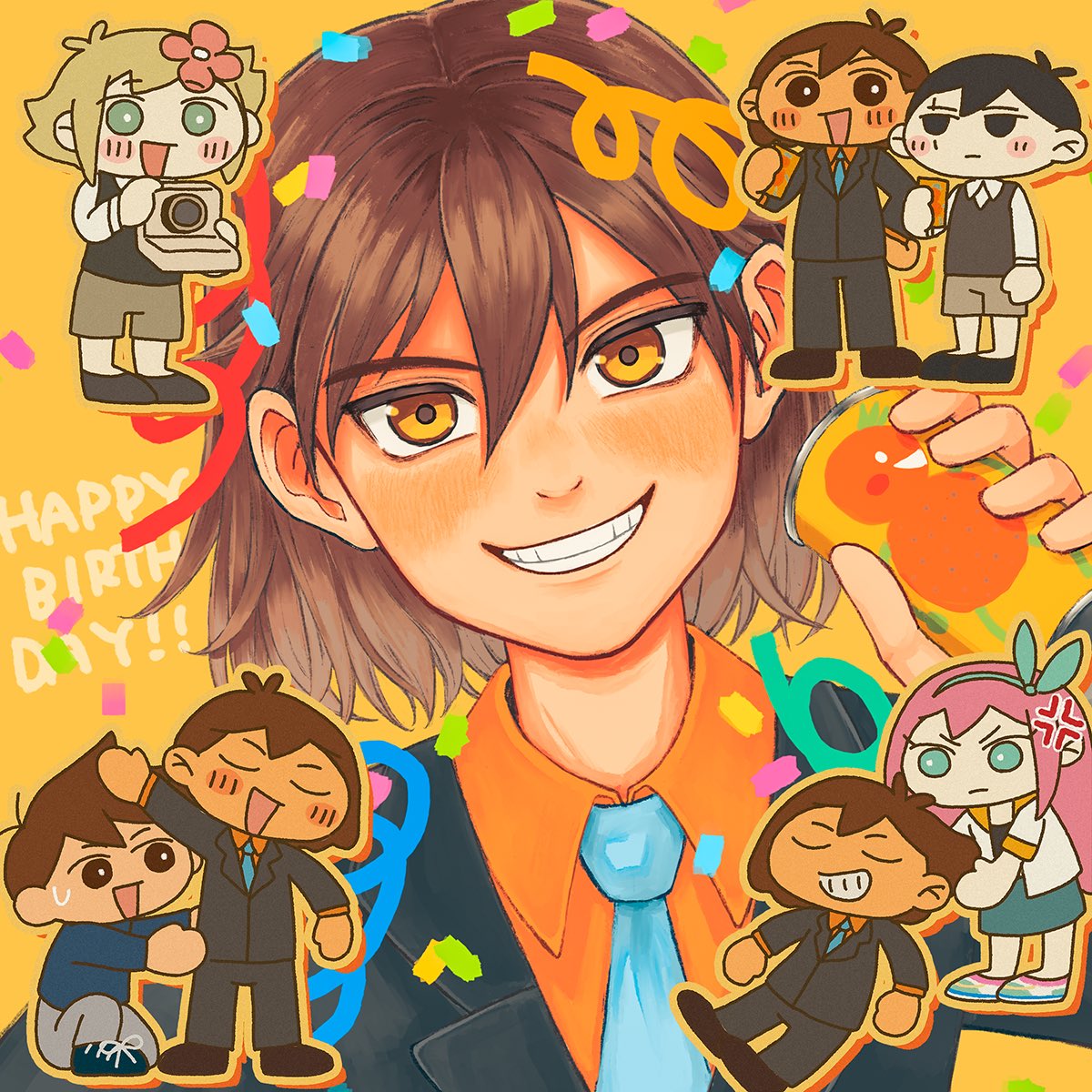 1girl 4boys anger_vein aubrey_(faraway)_(omori) aubrey_(omori) basil_(faraway)_(omori) basil_(omori) black_eyes black_hair black_pants black_sweater_vest blonde_hair blue_eyes blue_hairband blue_necktie brown_eyes brown_hair brown_shorts camera can chibi closed_eyes closed_mouth collared_shirt confetti dark-skinned_male dark_skin flower formal_clothes grin hair_flower hair_ornament hairband happy_birthday hero_(faraway)_(omori) hero_(omori) highres holding holding_camera holding_can kel_(faraway)_(omori) kel_(omori) long_hair long_sleeves looking_at_another looking_at_viewer msdnno_kabe multiple_boys necktie omori open_mouth orange_joe_(omori) orange_shirt pants pink_hair scar scar_across_eye scar_on_face shirt short_hair short_sleeves shorts smile spoilers suit sunny_(omori) sweater_vest teeth white_shirt