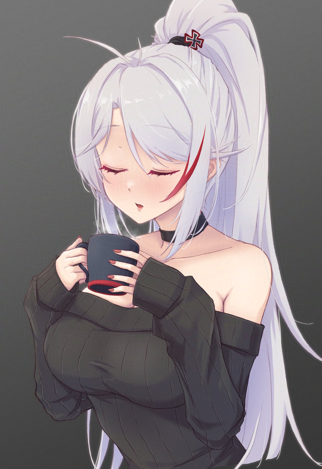 1girl alternate_costume alternate_hairstyle antenna_hair azur_lane bare_shoulders black_choker black_sweater blush breasts choker closed_eyes commentary commentary_request cross cup drinking eyelashes fingernails gradient_background grey_background hair_tie hands_up high_ponytail highres holding holding_cup iron_cross large_breasts long_hair long_sleeves multicolored_hair off-shoulder_sweater off_shoulder open_mouth parted_lips ponytail prinz_eugen_(azur_lane) red_hair red_nails simple_background sleeves_past_wrists solo steam streaked_hair sweater swept_bangs upper_body very_long_hair waa!_okami white_hair