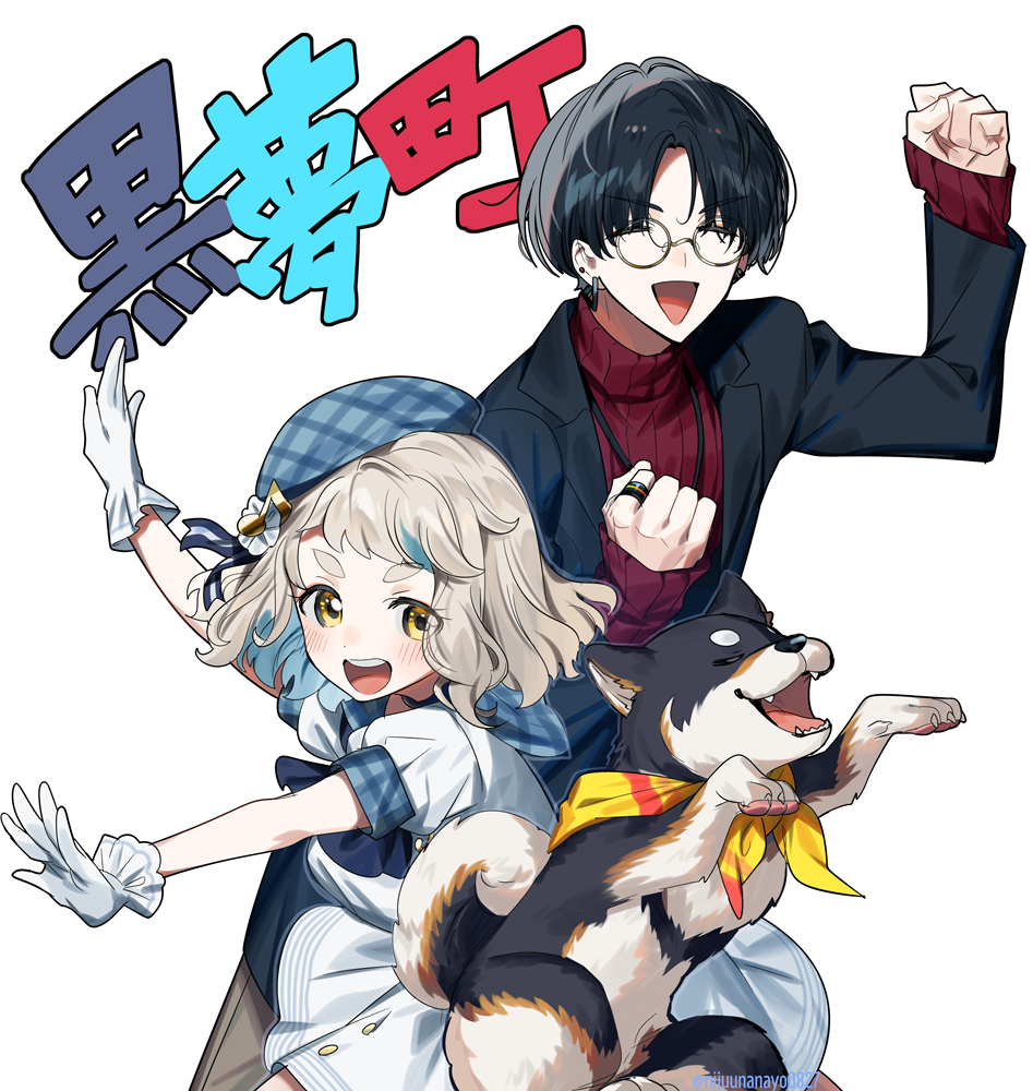 1boy 1girl :d arm_up artist_name ascot beret black_coat black_hair blonde_hair blue_ascot blue_hair blue_hat blue_sailor_collar blush buttons claws clenched_hands closed_eyes coat commentary_request dog dress ear_piercing earrings eyelashes fangs fortissimo glasses gloves hair_ornament hair_ribbon hand_up hat jewelry kokumucho_(nijisanji) kuroi_shiba lapels long_sleeves looking_at_viewer machita_chima machita_chima_(sailor_dress) machita_chima_(sailor_dress) multicolored_hair musical_note musical_note_hair_ornament neckerchief necklace nijisanji ninahachi official_alternate_costume open_clothes open_coat open_mouth outstretched_arms parted_bangs piercing plaid_clothes plaid_hat plaid_sailor_collar puffy_short_sleeves puffy_sleeves red_sweater ribbed_sweater ribbon ring round_eyewear sailor_collar sailor_dress shiba_inu short_hair short_sleeves simple_background sleeves_past_wrists smile streaked_hair sweater teeth thick_eyebrows translation_request turtleneck turtleneck_sweater twitter_username upper_teeth_only v-shaped_eyebrows virtual_youtuber white_background white_dress white_gloves yellow_eyes yellow_neckerchief yumeoi_kakeru yumeoi_kakeru_(5th_costume)