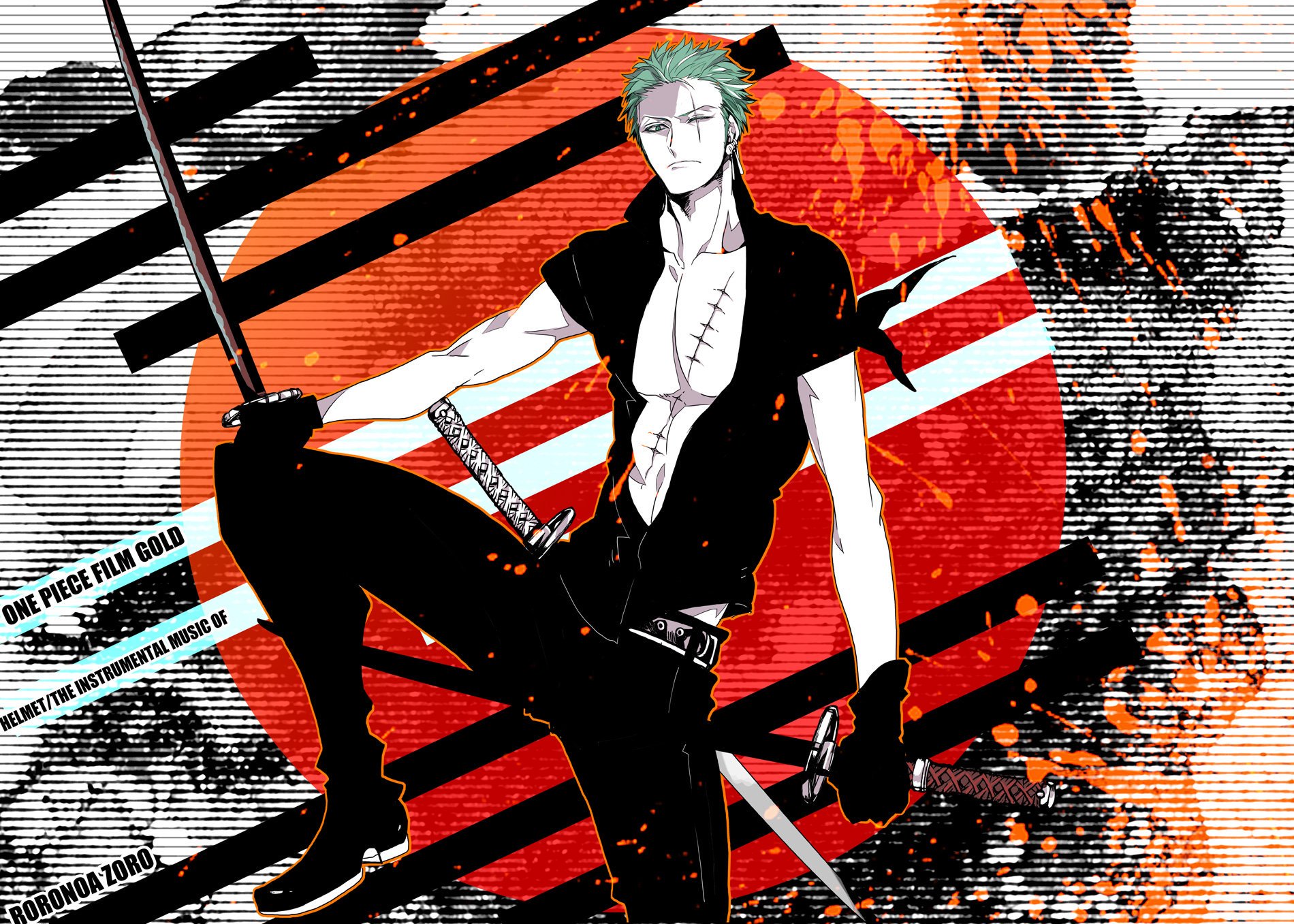 1boy bandana_around_arm circle earrings gdi999xxx gloves green_hair highres holding holding_sword holding_weapon jewelry limited_palette looking_at_viewer male_focus one_eye_closed one_piece one_piece_film:_gold roronoa_zoro scar scar_across_eye scar_on_face short_hair solo stitched_torso stitches sword weapon