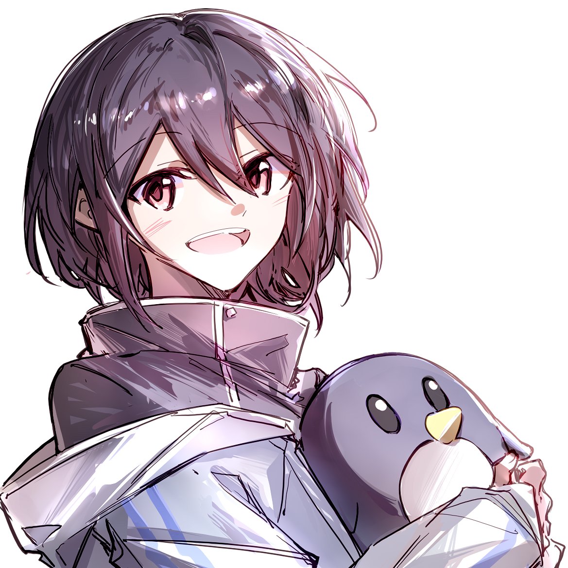 1girl bang_dream! bang_dream!_it's_mygo!!!!! grey_hair grey_shirt hair_between_eyes hibioes hugging_object jacket long_sleeves looking_at_viewer open_mouth red_eyes shirt simple_background solo stuffed_animal stuffed_penguin stuffed_toy takamatsu_tomori teeth upper_body upper_teeth_only white_background white_jacket