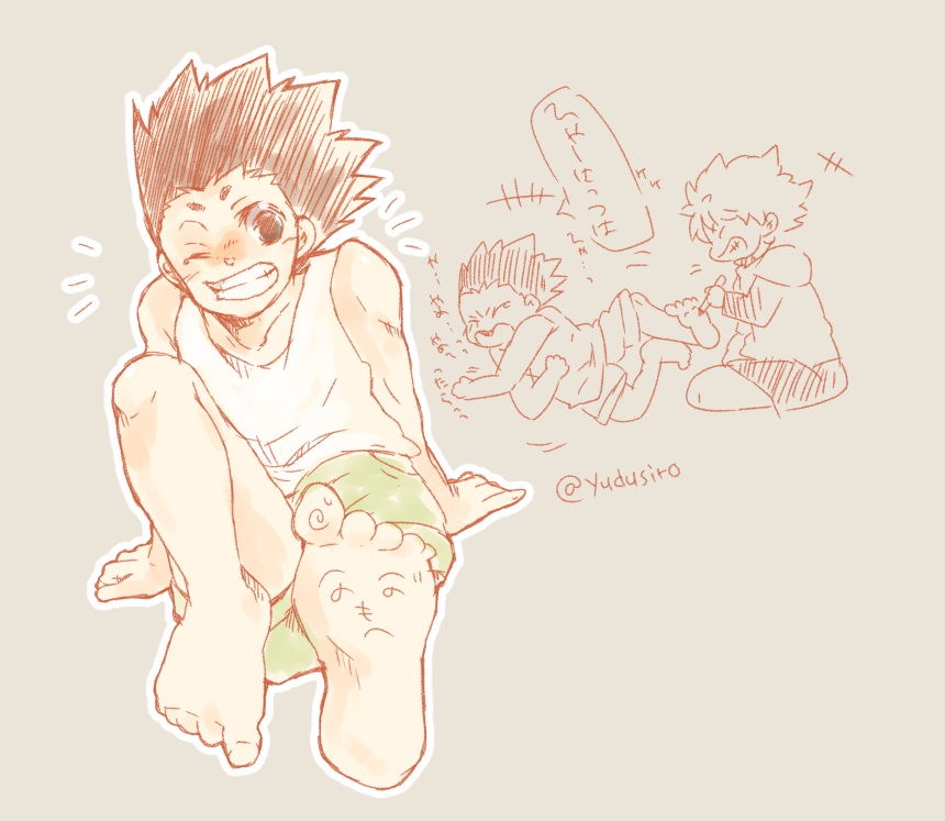 2boys artist_request bare_legs barefoot blush body_writing child feet gon_freecss grin hunter_x_hunter killua_zoldyck kneeling laughing legs lying madhouse multiple_boys playing shirt shounen_jump sitting sleeveless sleeveless_shirt smile soles spiked_hair tickles tickling tickling_feet toes yaoi