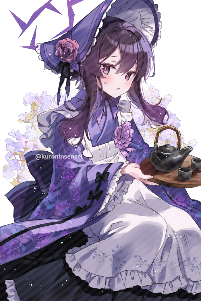 1girl apron blue_archive bonnet commentary_request cup flower hair_between_eyes halo haruka_(blue_archive) holding holding_tray japanese_clothes kimono kuroninsensei long_sleeves looking_at_viewer maid maid_apron parted_lips purple_eyes purple_flower purple_hair purple_halo purple_kimono simple_background solo sweatdrop teacup teapot tray twitter_username wa_maid white_apron wide_sleeves