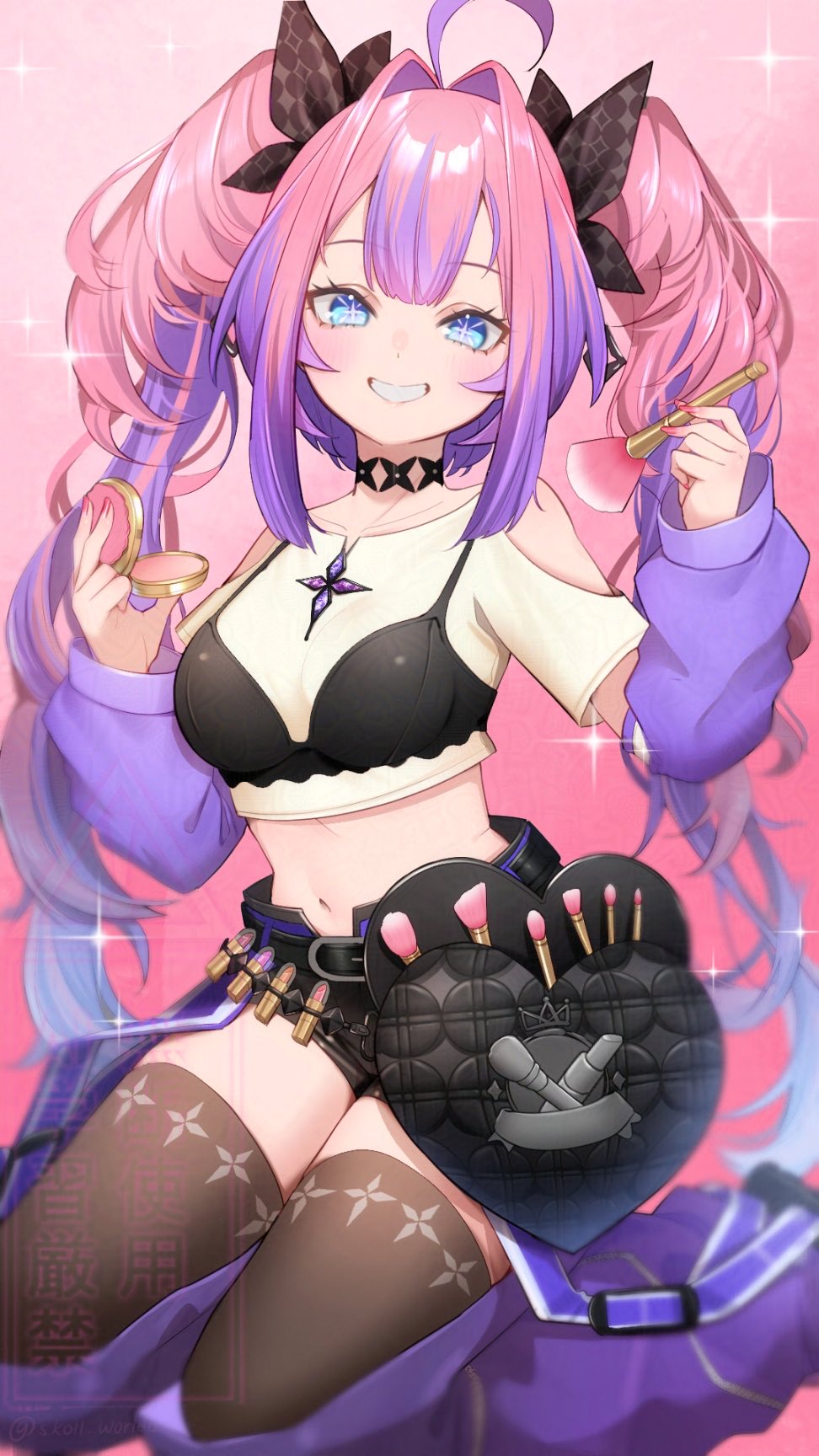 1girl ahoge black_shorts blue_eyes bra_over_clothes breasts commentary grin hair_intakes highres hololive hololive_dev_is kikirara_vivi makeup_brush medium_breasts midriff multicolored_hair navel pink_hair purple_hair shorts skoll_world smile untranslatable_commentary thighhighs twintails two-tone_hair virtual_youtuber