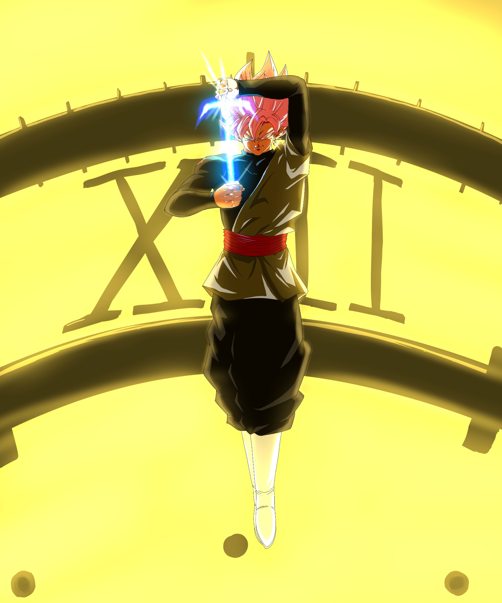 black_pants black_shirt boots clock clock_tower dougi dragon_ball dragon_ball_super earrings energy_sword goku_black grey_eyes grey_tunic highres jewelry kazumax76 long_sleeves medium_hair pants pink_hair potara_earrings red_sash sash shirt simple_background single_earring spiked_hair super_saiyan super_saiyan_rose sword tower tunic weapon white_boots yellow_background