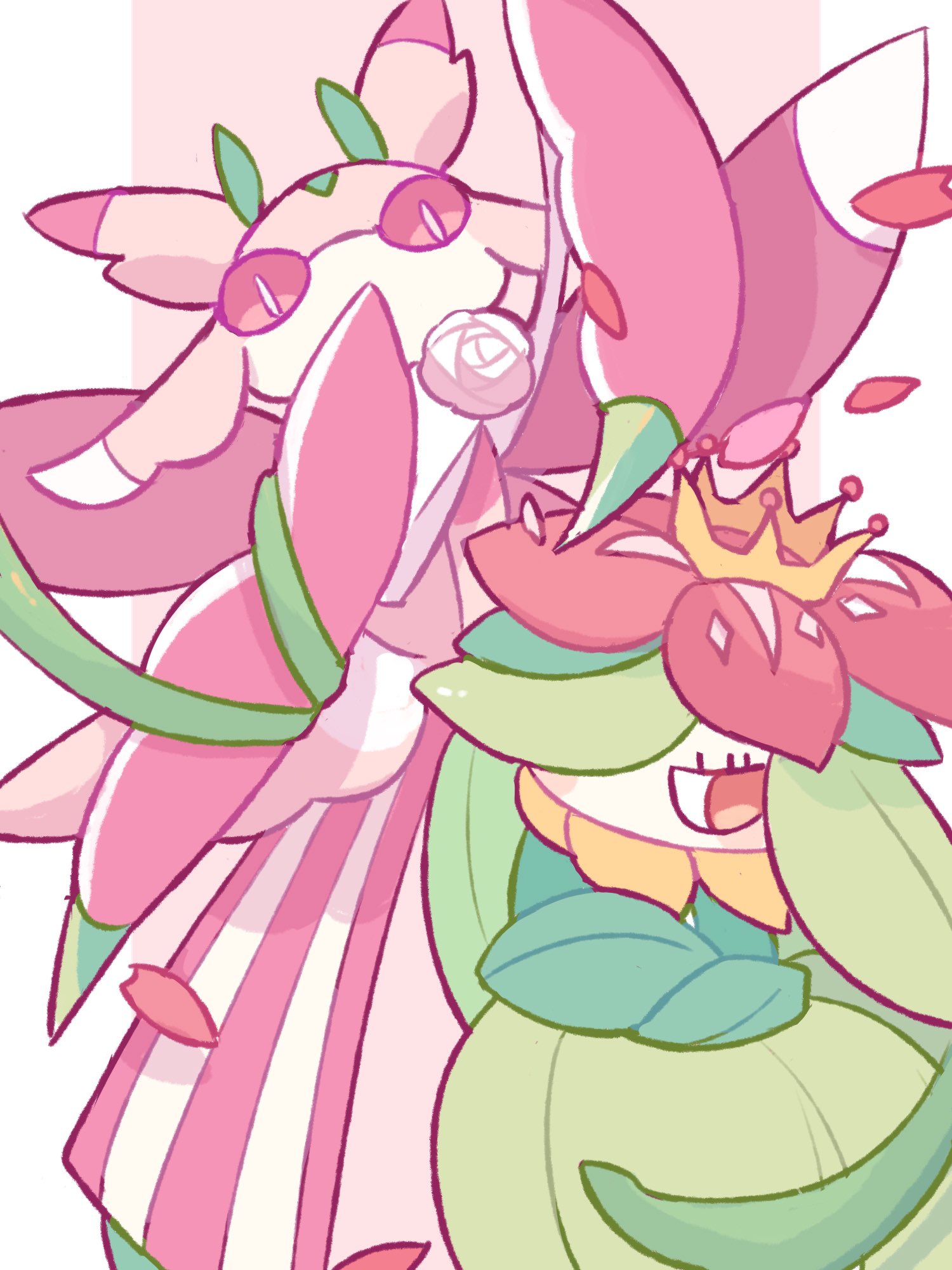2girls antennae arthropod_girl arthropod_limbs bibi_(kano2541293757) blush colored_sclera colored_skin crown dress falling_petals flower full_body furry gen_5_pokemon gen_7_pokemon green_dress green_hair hair_flower hair_ornament highres lilligant long_hair looking_at_another lurantis mini_crown monster_girl multiple_girls nintendo no_mouth petals pink_eyes pink_flower pink_hair pink_rose pink_skin plant plant_girl plant_hair pokemon pokemon_(creature) praying_mantis red_eyes red_flower rose sidelocks simple_background standing striped_clothes vines white_background white_skin