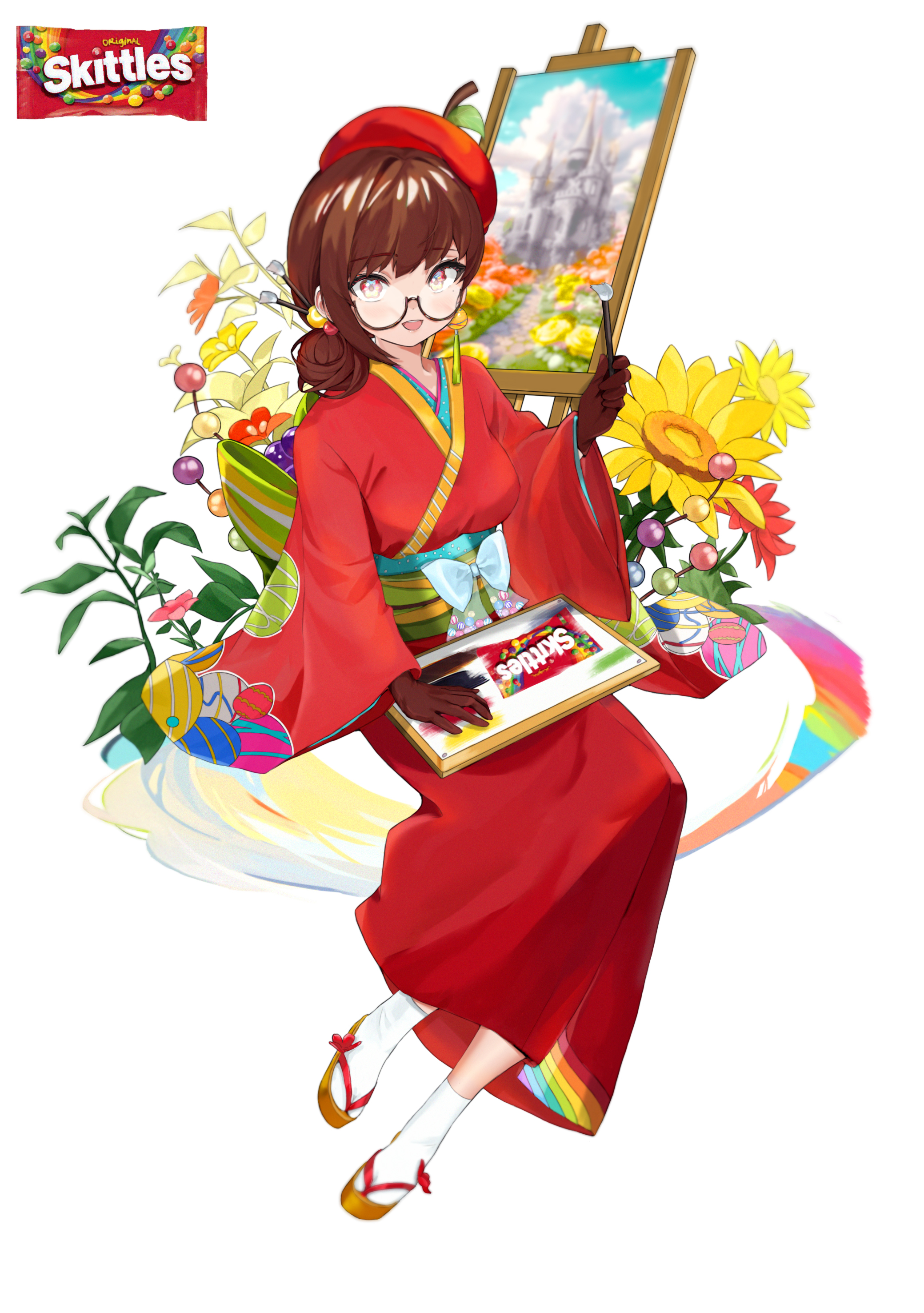 1girl absurdres artist_painter beret bow brown_hair chinese_commentary commentary_request earrings easel flower food-themed_hat full_body glasses gloves hair_bun hat highres holding holding_paintbrush japanese_clothes jewelry kimono long_sleeves looking_at_viewer obi open_mouth original paintbrush paintbrush_hair_ornament painting_(action) painting_(object) paper red_eyes rou_bao_mao-gravity5 sash skittles smile socks solo sunflower tabi tassel tassel_earrings wavy_eyes wide_sleeves