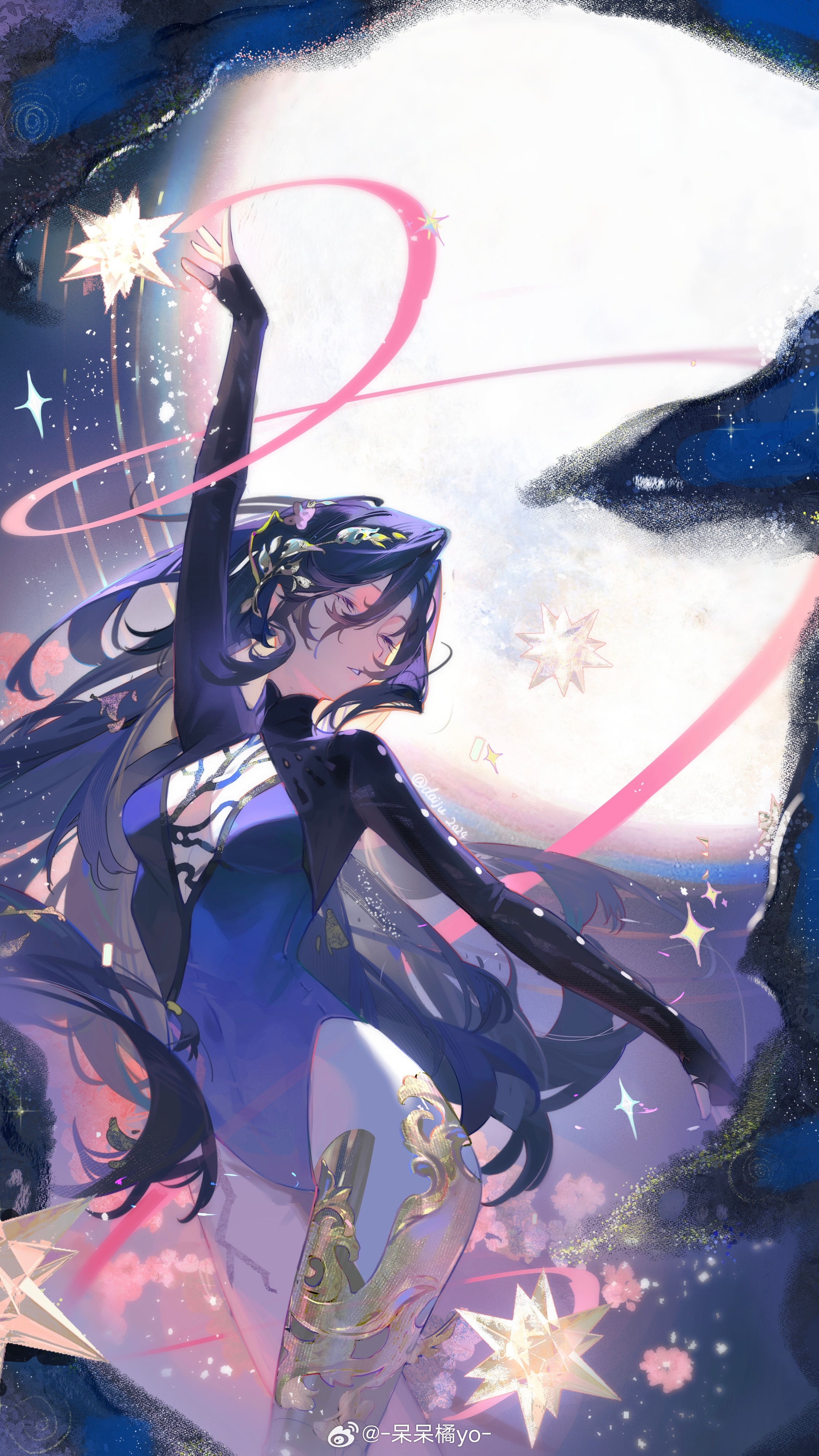 1girl absurdres arm_up athletic_leotard black_leotard blue_background blue_hair blue_leotard breasts cleavage cleavage_cutout closed_eyes clothing_cutout covered_navel cowboy_shot dark_blue_hair floating_hair hair_ornament hand_up highres leaf_hair_ornament leotard long_hair medium_breasts multicolored_leotard outstretched_arm pantyhose parted_lips pink_ribbon prosthesis prosthetic_leg reverse:1999 ribbon shimian_ju solo sparkle stellated_octahedron turning_head two-tone_leotard very_long_hair watermark weibo_watermark white_pantyhose willow_(reverse:1999)