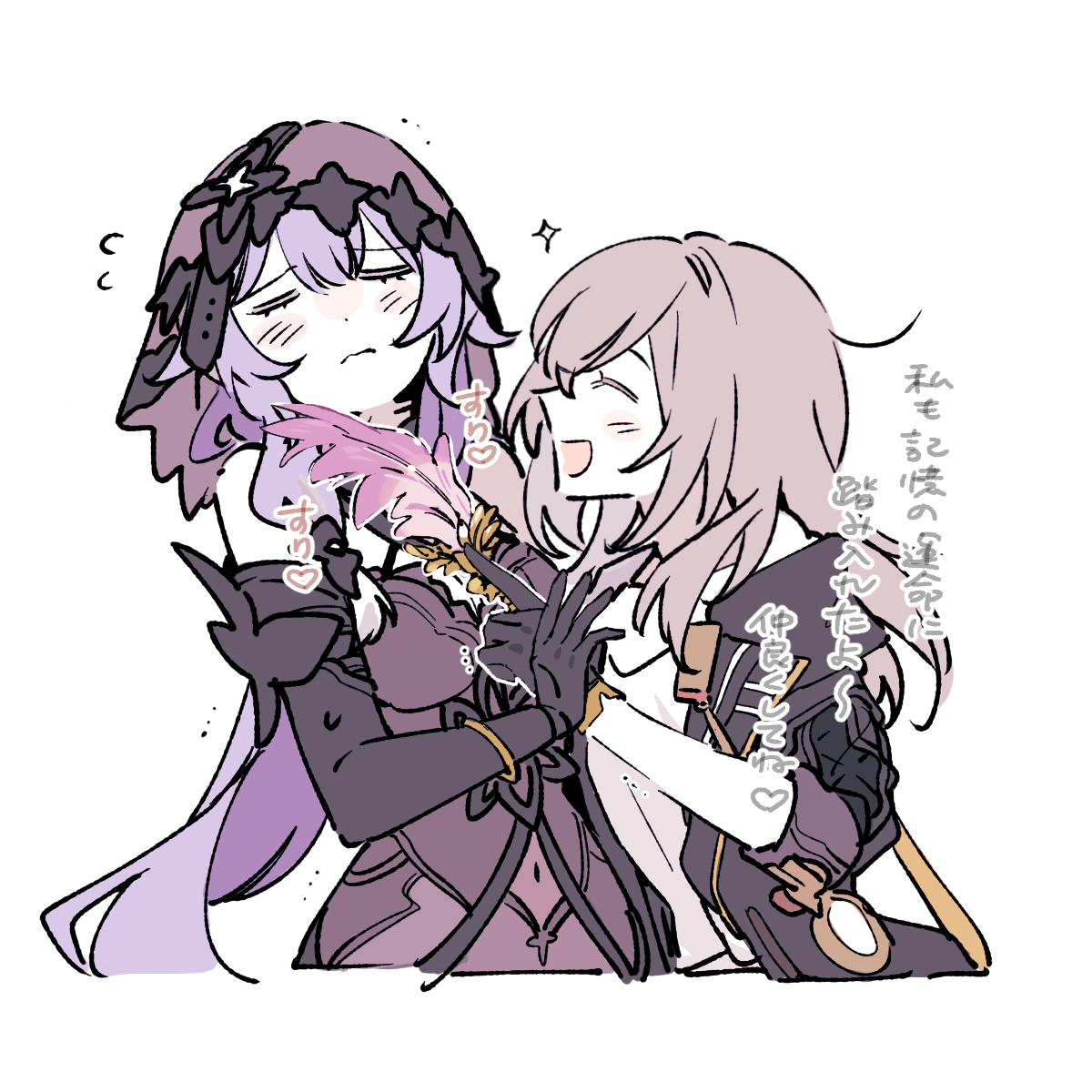2girls :d ^_^ black_gloves black_jacket black_swan_(honkai:_star_rail) blush closed_eyes closed_mouth cropped_legs elbow_gloves feathers flying_sweatdrops gloves grey_hair highres holding holding_feather honkai:_star_rail honkai_(series) jacket long_hair multiple_girls open_clothes open_jacket open_mouth purple_feathers purple_hair rizu033 shirt simple_background smile sparkle stelle_(honkai:_star_rail) sweat tickling tickling_face trailblazer_(honkai:_star_rail) translation_request u_u white_background white_shirt yuri