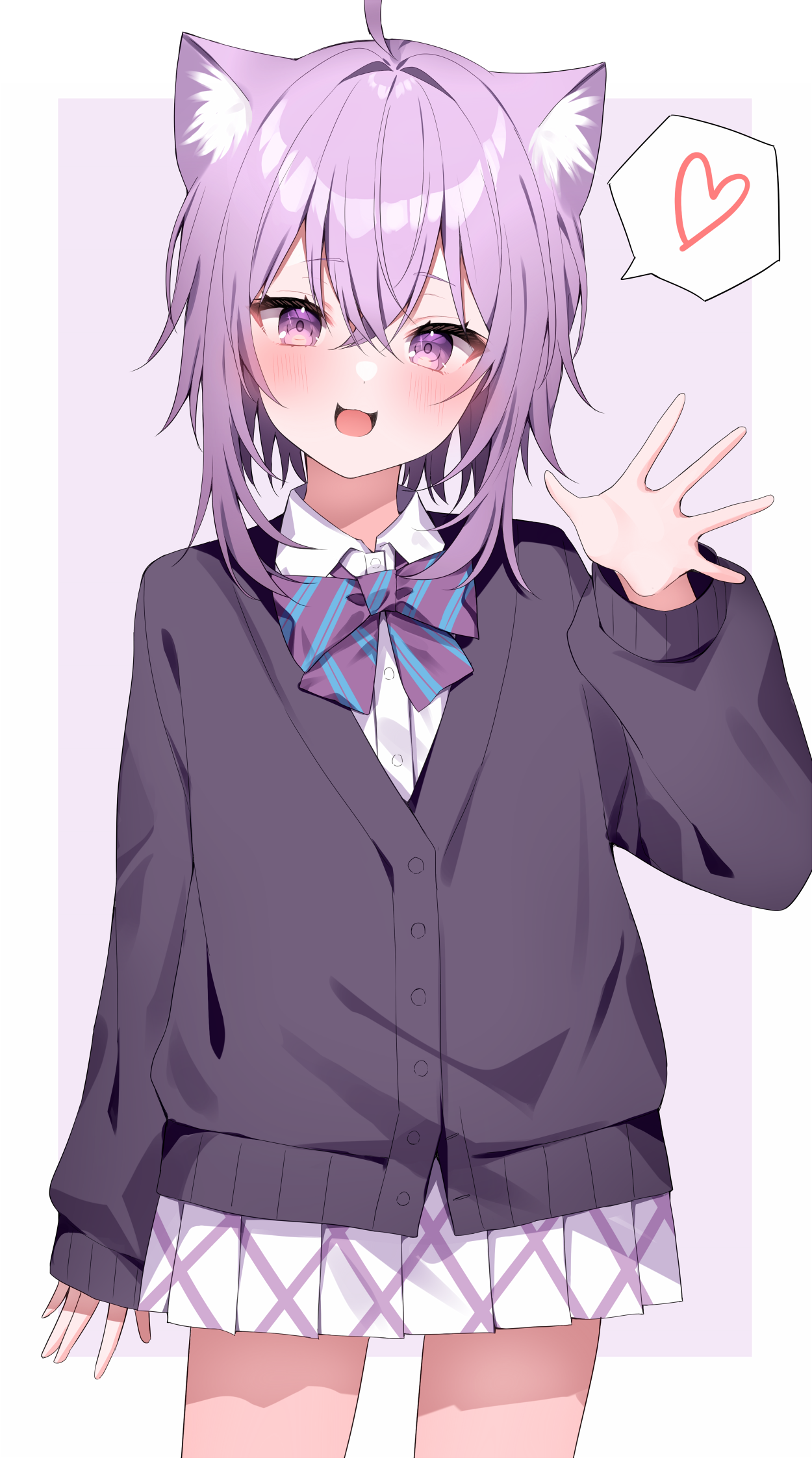 ahoge alternate_costume animal_ear_fluff animal_ears cardigan cat_ears cat_girl heart highres hololive looking_at_viewer maruru_(marurupan) nekomata_okayu open_mouth purple_cardigan purple_eyes purple_hair shirt short_hair skirt smile solo spoken_heart virtual_youtuber waving white_shirt white_skirt
