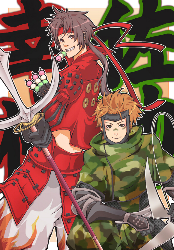 2boys brown_eyes brown_hair camouflage dango eringi_oishii facepaint flame_print food forehead_protector headband holding holding_polearm holding_weapon jacket long_hair low_ponytail male_focus mouth_hold multiple_boys orange_hair pants polearm ponytail red_headband red_jacket sanada_clan_(emblem) sanada_yukimura_(sengoku_basara) sanshoku_dango sarutobi_sasuke_(sengoku_basara) sengoku_basara smile spear teeth_hold wagashi weapon white_pants
