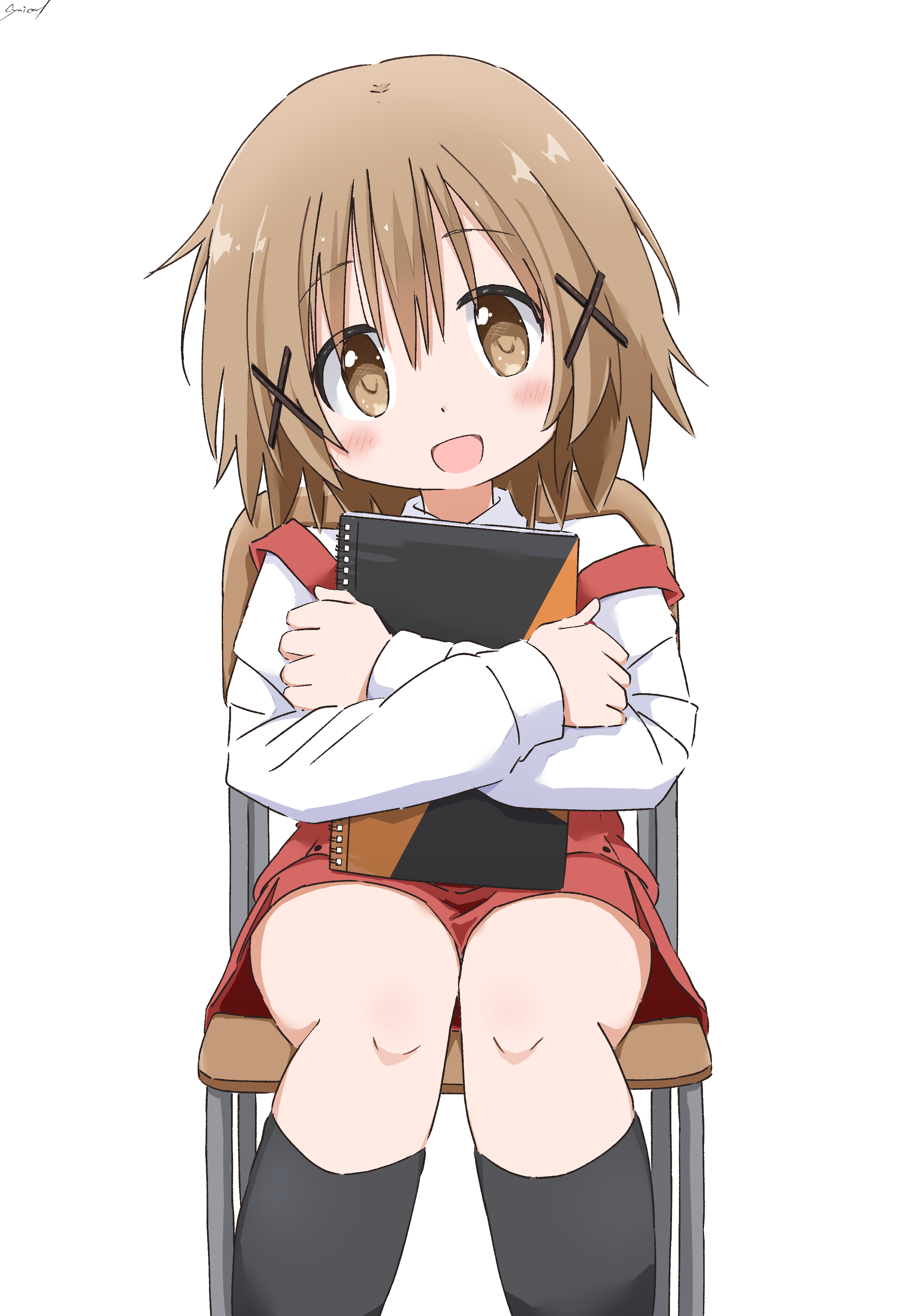 1girl absurdres artist_name black_socks blush brown_eyes brown_hair cynical_(llcbluckg_c004) dot_nose facing_viewer female_focus hair_ornament hidamari_sketch highres holding holding_sketchbook legs long_sleeves open_mouth school_uniform short_hair simple_background sitting sketchbook socks solo white_background x_hair_ornament yamabuki_high_school_uniform yuno_(hidamari_sketch)
