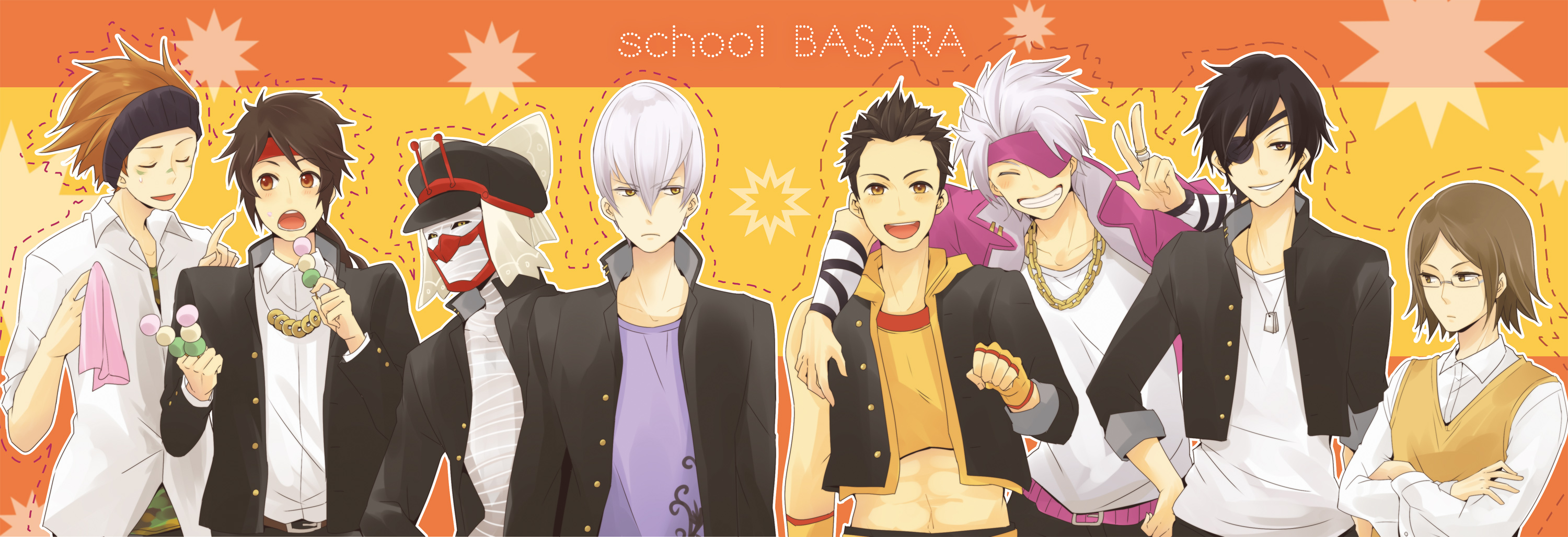 6+boys :d :o ^_^ arm_around_shoulder black_hair black_hat black_headband black_jacket black_sclera brown_eyes brown_hair chain chain_necklace chousokabe_motochika_(sengoku_basara) closed_eyes collared_shirt colored_sclera copyright_name cropped_jacket cropped_shirt dango date_masamune_(sengoku_basara) dog_tags dotted_line eringi_oishii eyepatch food frown gakuen_basara gakuran glasses grin hair_between_eyes hat headband highres ishida_mitsunari_(sengoku_basara) jacket jewelry looking_at_another looking_at_viewer male_focus midriff mouri_motonari_(sengoku_basara) multiple_boys necklace ootani_yoshitsugu_(sengoku_basara) open_mouth purple_shirt red_eyes red_headband sanada_yukimura_(sengoku_basara) sanshoku_dango sarutobi_sasuke_(sengoku_basara) school_uniform sengoku_basara shirt short_hair smile tokugawa_ieyasu_(sengoku_basara) v wagashi white_hair white_shirt yellow_eyes yellow_shirt