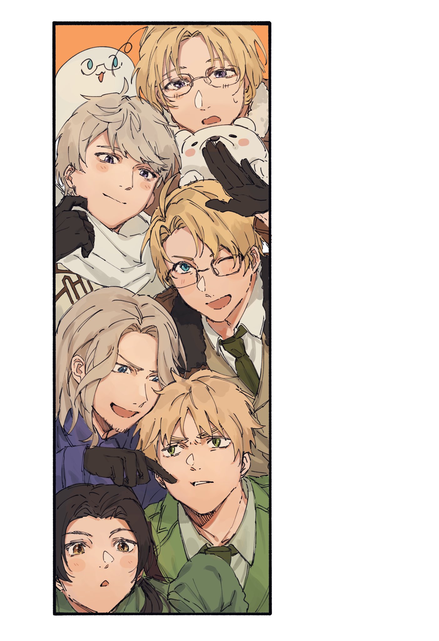 6+boys america_(hetalia) axis_powers_hetalia black-framed_eyewear black_gloves black_hair blonde_hair blue_eyes brown_eyes brown_jacket canada_(hetalia) china_(hetalia) closed_mouth coat collared_jacket collared_shirt france_(hetalia) fur-trimmed_jacket fur_trim glasses gloves green_eyes green_jacket green_necktie grey_hair hair_between_eyes hand_up highres hkym_kk jacket lapels long_hair long_sleeves looking_at_another looking_at_viewer male_focus military_jacket military_uniform multiple_boys necktie one_eye_closed open_clothes open_jacket open_mouth orange_background ponytail purple_eyes purple_jacket russia_(hetalia) scarf semi-rimless_eyewear shirt short_hair simple_background smile teeth united_kingdom_(hetalia) upper_body white_coat white_scarf white_shirt