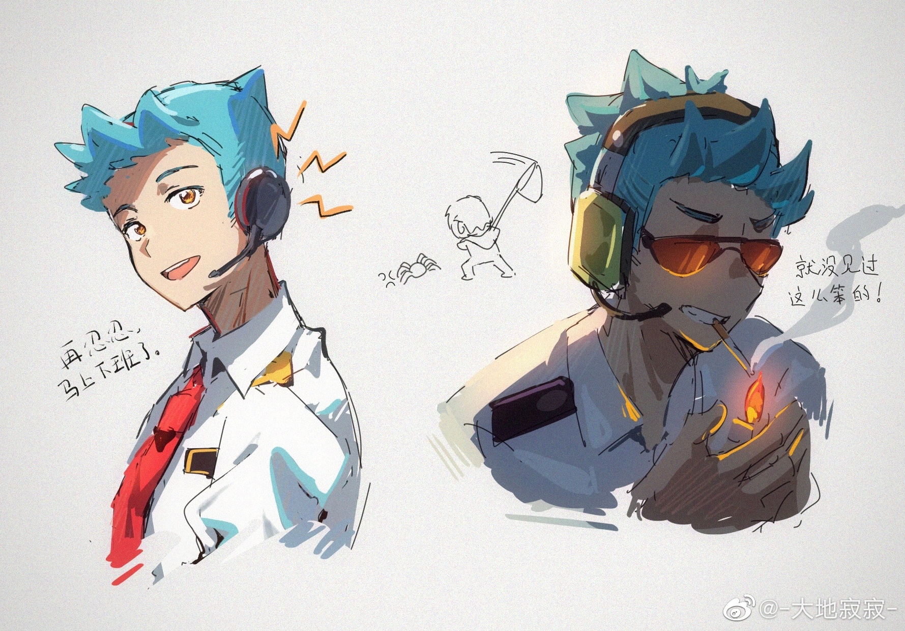 2boys animal_crossing animal_crossing:_new_horizons blue_hair cigarette collared_shirt cropped_torso dadijiji grey_background highres humanization lighting_cigarette male_focus mouth_hold multiple_boys nintendo orville_(animal_crossing) shirt sideburns smoking sunglasses teeth_hold translation_request villager_(animal_crossing) white_shirt wilbur_(animal_crossing)