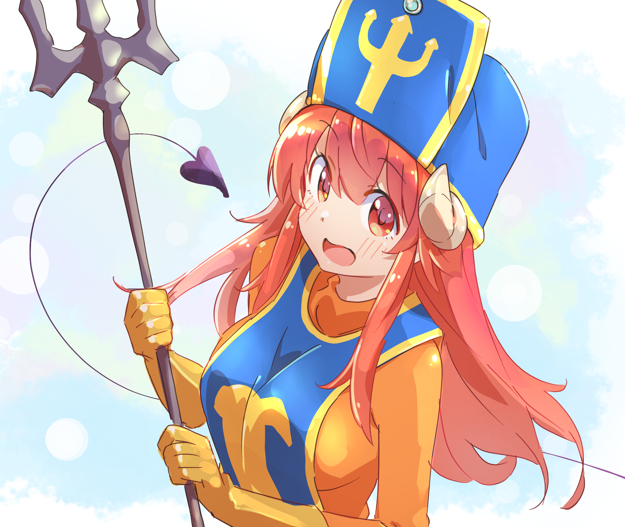 1girl blue_hat blue_tabard bodysuit breasts commentary_request cosplay curled_horns demon_girl demon_tail dragon_quest dragon_quest_iii hat highres holding holding_polearm horns icorasama long_hair looking_at_viewer machikado_mazoku medium_breasts open_mouth orange_bodysuit polearm priest_(dq3) priest_(dq3)_(cosplay) red_eyes solo tabard tail trident weapon yoshida_yuuko