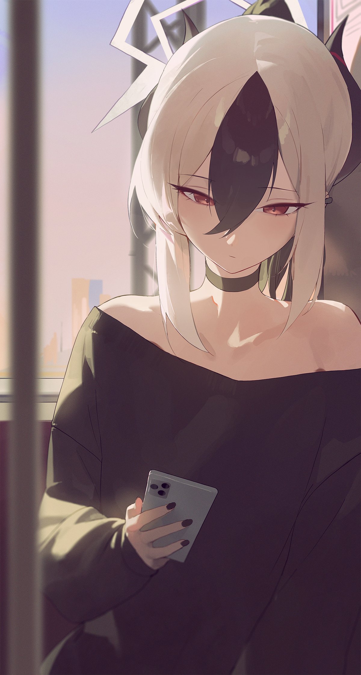 1girl black_choker black_horns blue_archive choker demon_horns ear_piercing grey_halo halo highres holding holding_phone horns kayoko_(blue_archive) kji_(rozo) multicolored_hair phone piercing red_eyes solo two-tone_hair white_hair