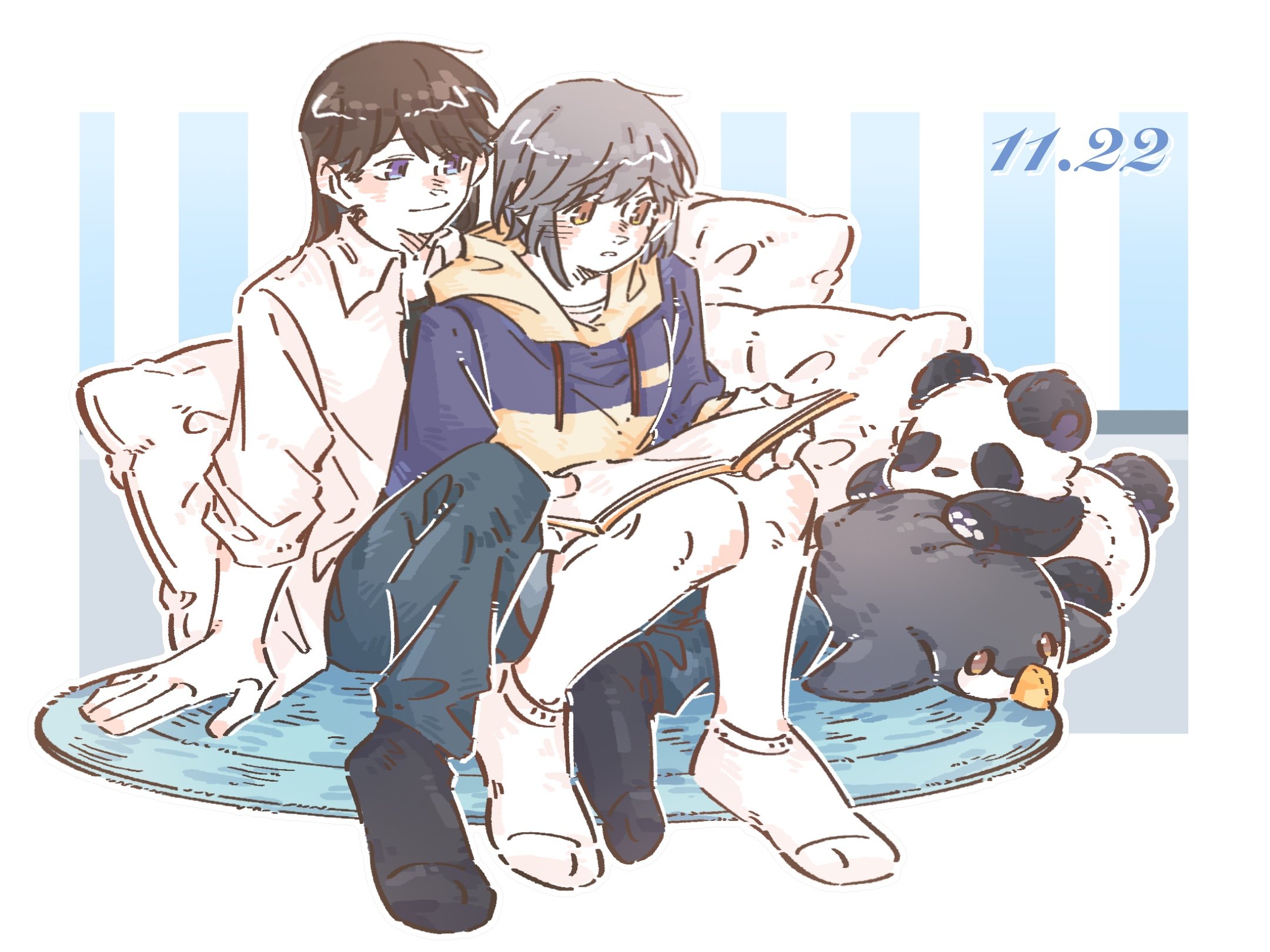 2girls artist_request bang_dream! bang_dream!_it's_mygo!!!!! black_socks blue_hoodie blue_pants blush book brown_eyes brown_hair chinese_commentary closed_mouth commentary commission dated grey_hair highres hood hood_down hoodie indoors jacket long_hair multiple_girls open_book open_mouth pants purple_eyes rug second-party_source shiina_taki short_hair sitting socks stuffed_animal stuffed_panda stuffed_penguin stuffed_toy takamatsu_tomori white_jacket white_socks yuri
