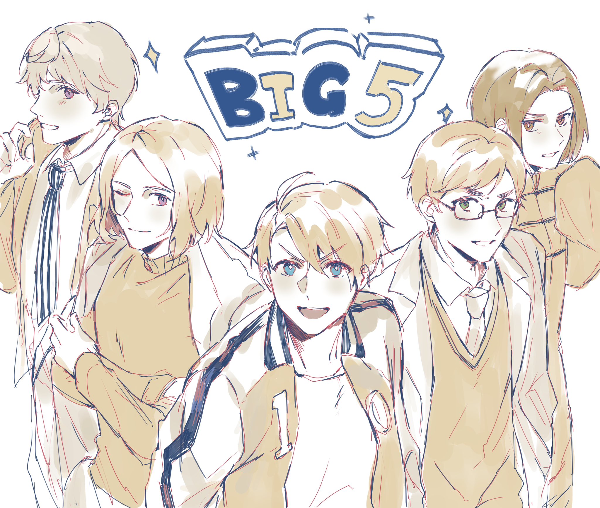 5boys america_(hetalia) axis_powers_hetalia blue_eyes brown_eyes changpao china_(hetalia) chinese_clothes closed_mouth collared_shirt cowboy_shot crossed_arms english_text france_(hetalia) glasses hair_between_eyes hand_up hands_in_pockets highres hkym_kk jacket lapels long_sleeves looking_at_viewer male_focus multiple_boys necktie one_eye_closed open_clothes open_jacket open_mouth pants purple_eyes russia_(hetalia) semi-rimless_eyewear shirt short_hair simple_background smile sparkle standing sweater t-shirt teeth turtleneck turtleneck_sweater united_kingdom_(hetalia) v-shaped_eyebrows vest wide_sleeves
