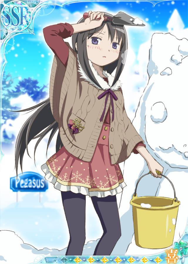 1girl akemi_homura artist_request black_hair black_pantyhose blue_sky bow bowtie brown_poncho bucket buttons card_(medium) castle character_snowman day feet_out_of_frame frilled_skirt frills fur-trimmed_poncho fur_trim game_cg hand_on_own_head high-waist_skirt holding holding_bucket holding_shovel horse jitome kyubey light_blush long_hair long_sleeves looking_at_viewer mahou_shoujo_madoka_magica mahou_shoujo_madoka_magica_plus miniskirt official_alternate_costume official_art outdoors outline pale_skin pantyhose parted_lips picture_frame pink_skirt purple_bow purple_bowtie purple_eyes red_shirt shirt shovel sidelocks sign skirt sky snowing snowman snowman_print solo straight_hair third-party_source three-quarter_sleeves tree very_long_hair white_outline winter winter_clothes