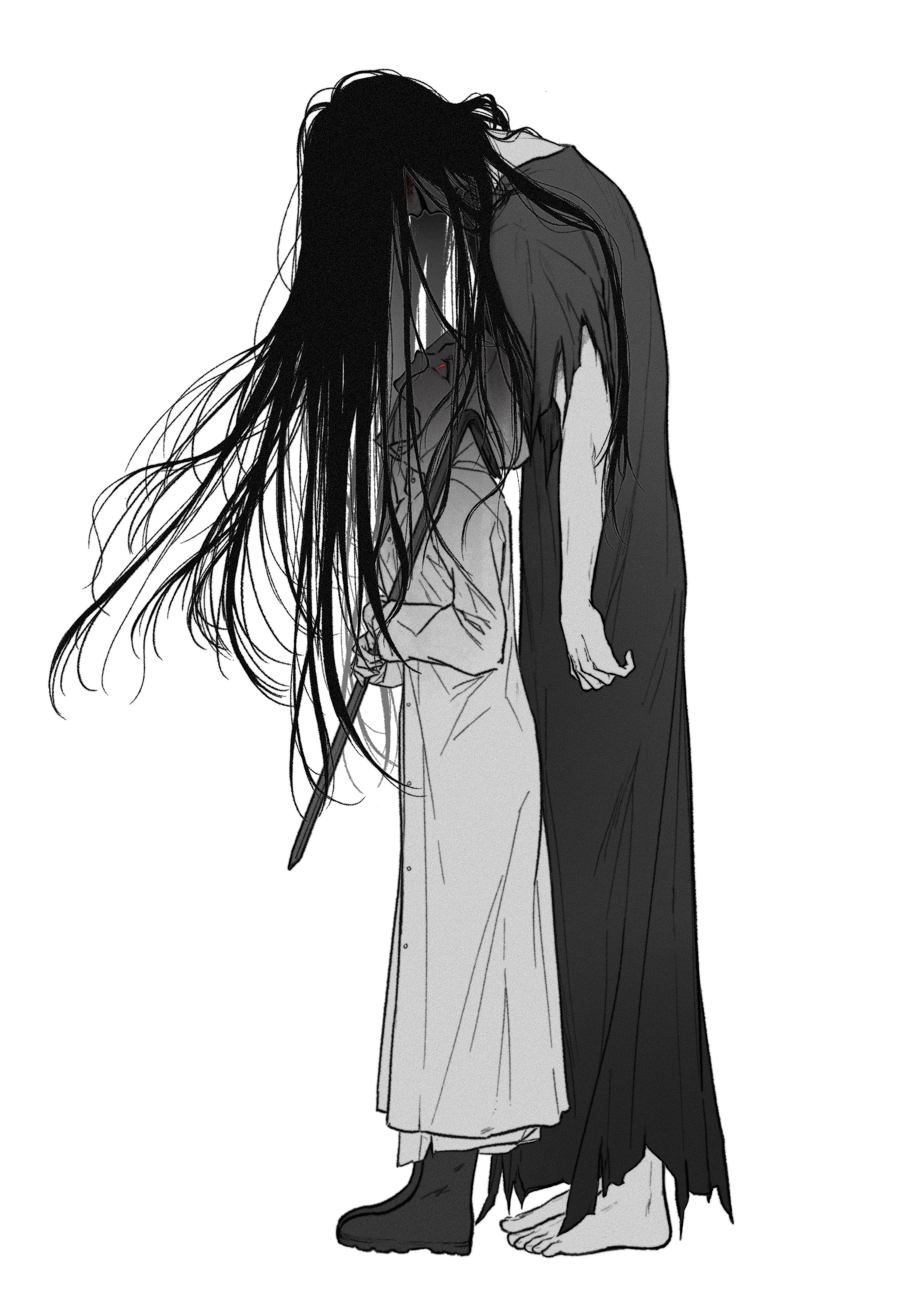1boy 1girl aaa_(9543479338) absurdres barefoot black_hair blood blood_on_face boots chinese_commentary commentary_request crowbar facing_down full_body adashino_adami highres holding holding_crowbar homicipher long_hair looking_at_another looking_up mr._crawling raincoat red_eyes simple_background spot_color standing very_long_hair white_background