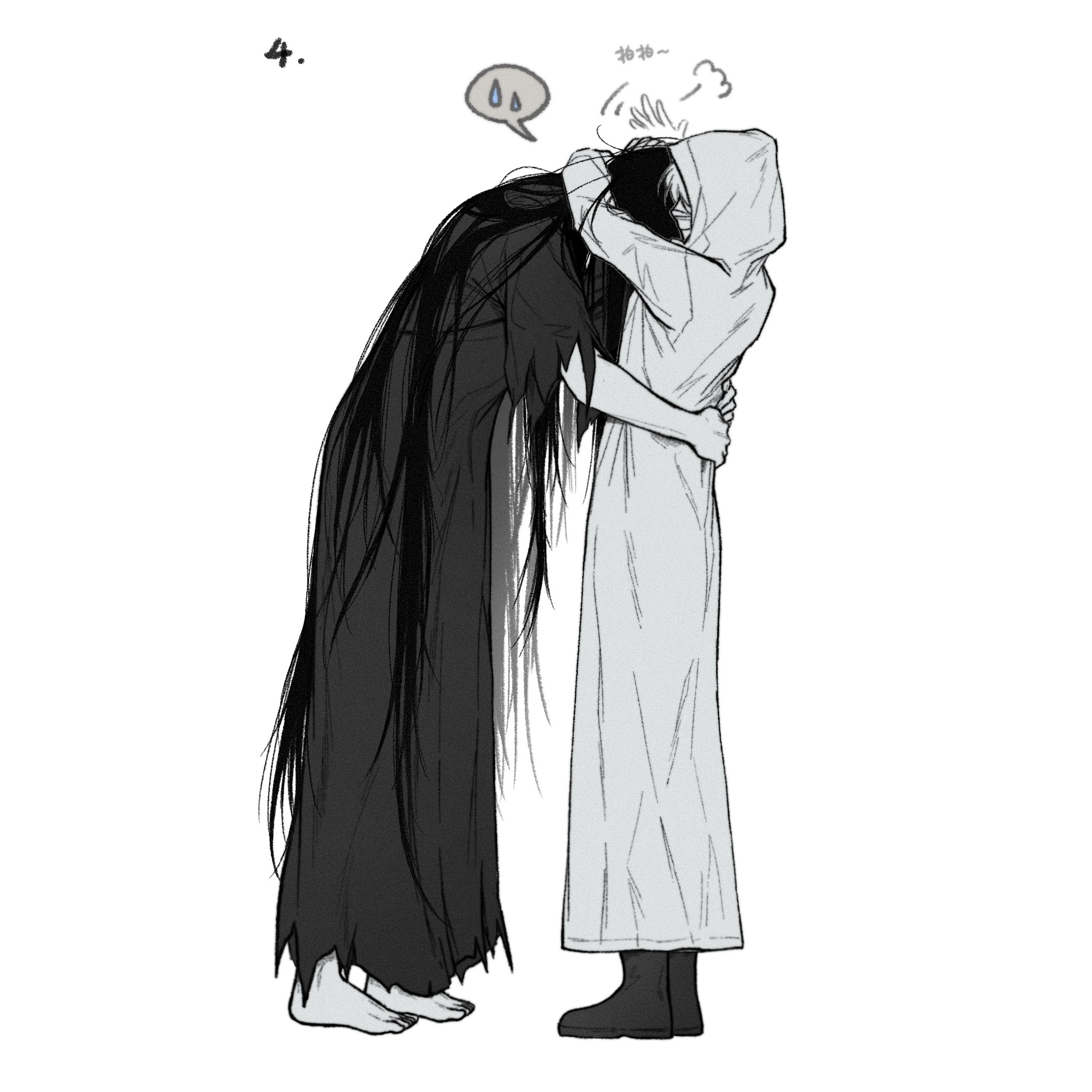 1boy 1girl aaa_(9543479338) barefoot black_hair black_kimono boots chinese_commentary commentary_request full_body headpat adashino_adami highres holding_hands homicipher hood hood_up hug japanese_clothes kimono long_hair mr._crawling raincoat short_hair simple_background standing translation_request very_long_hair white_background white_hair white_raincoat