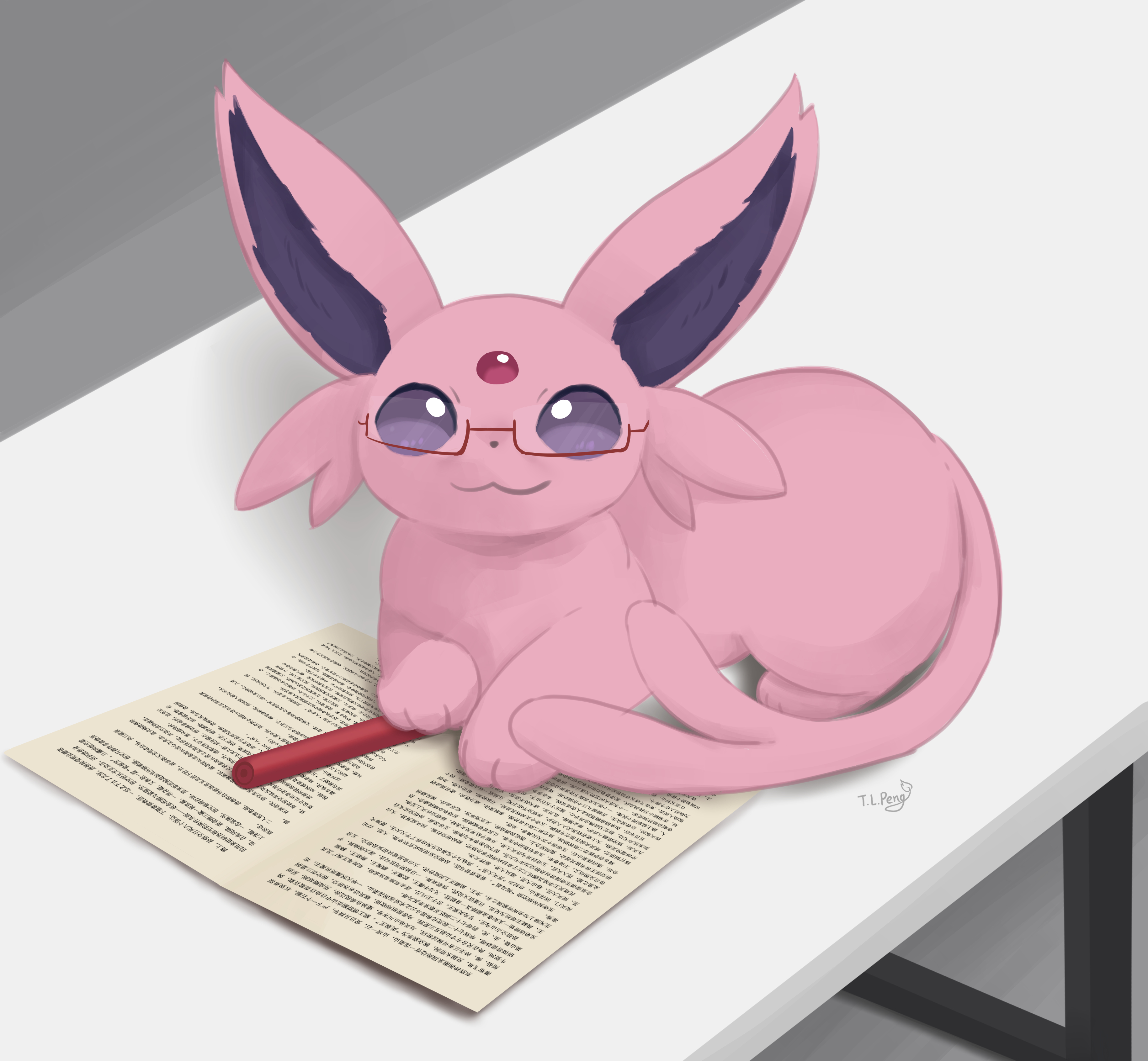 absurdres animal_focus bright_pupils closed_mouth espeon forehead_jewel forked_tail gen_2_pokemon glasses highres looking_up lying nintendo no_humans paper pokemon pokemon_(creature) purple_eyes smile solo table tail tl_peng white_pupils