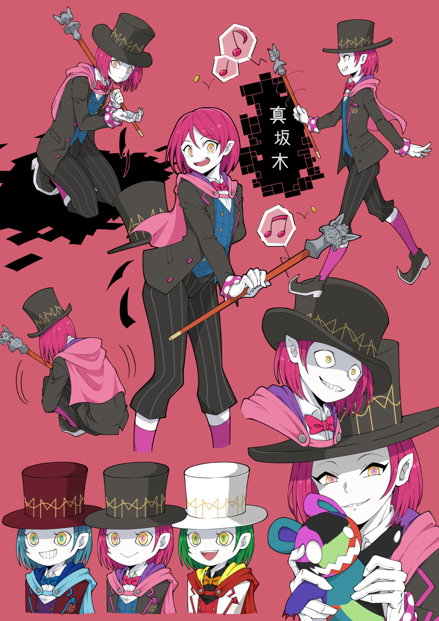 1boy androgynous black_hat black_jacket black_pants blue_hair blue_vest bob_cut bow bowtie c_(control) cane cape coin colored_skin eyelashes gloves gold_coin green_hair grin hat highres holding holding_cane jacket looking_at_viewer male_focus masakaki multiple_views musical_note open_mouth palette_swap pants pink_background pink_bow pink_bowtie pink_cape pink_hair pinstripe_pants pinstripe_pattern pointy_ears pointy_shoes purple_socks red_hat ringed_eyes shaded_face shiikuru shoes short_hair smile socks spoken_musical_note teeth top_hat translation_request vest white_gloves white_hat white_skin yellow_eyes