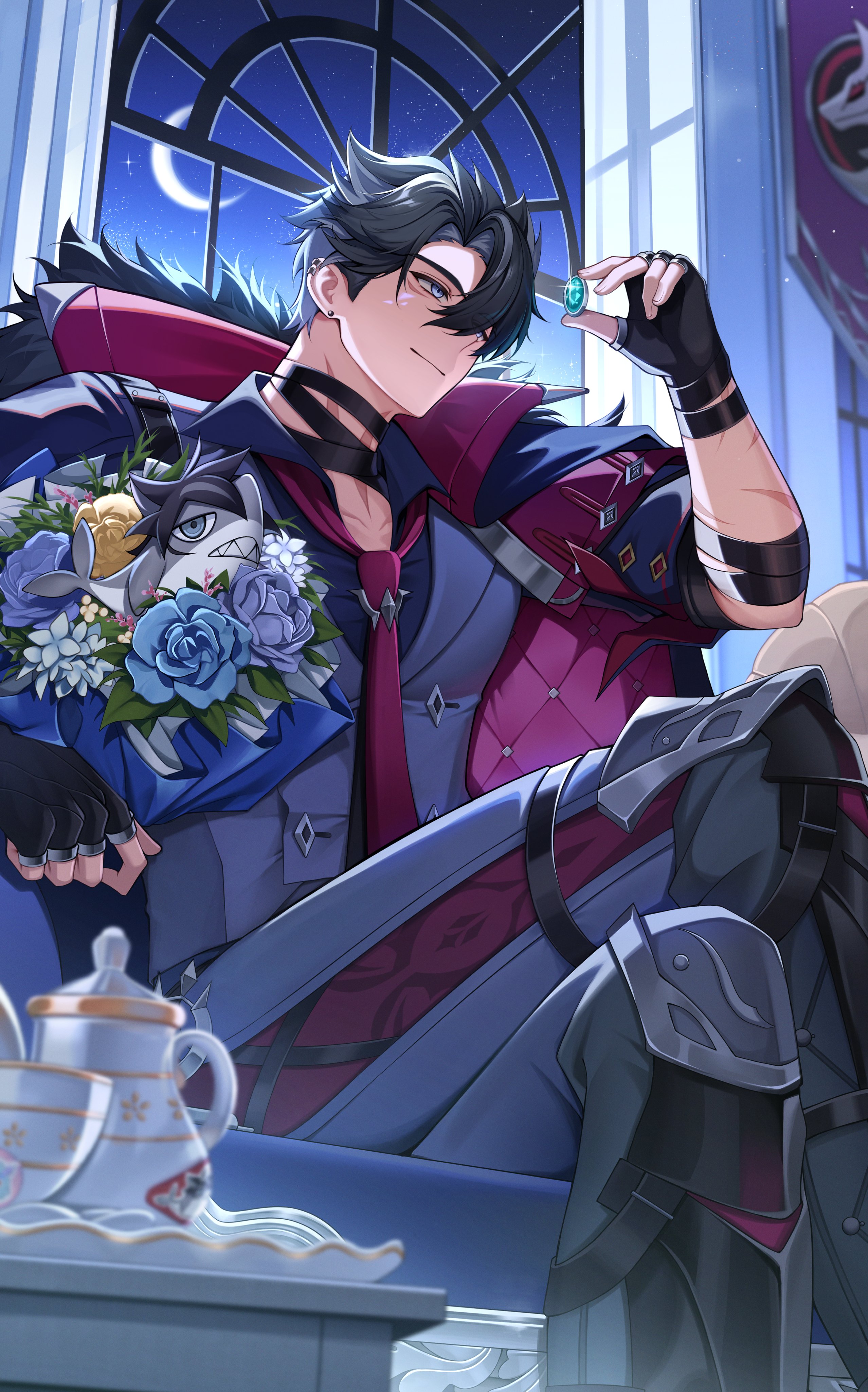1boy absurdres bandaged_arm bandaged_neck bandages black_bandages black_gloves black_hair black_shirt blue_eyes closed_mouth earrings fingerless_gloves flower gem genshin_impact gloves grey_hair grey_pants grey_vest hair_between_eyes highres holding holding_gem jewelry long_sleeves male_focus multicolored_hair necktie pants red_necktie rose scar scar_on_arm scar_on_neck shirt short_hair solcha solo streaked_hair vest wriothesley_(genshin_impact)