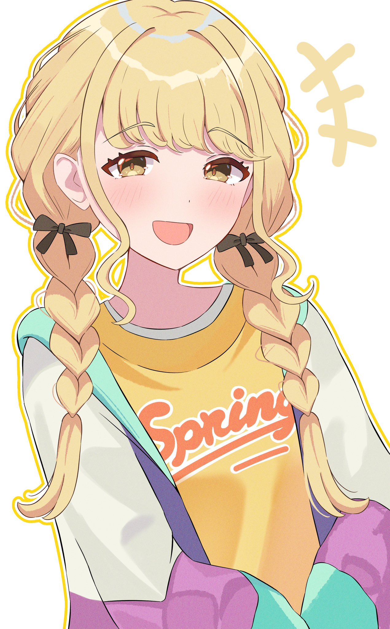 1girl black_bow blonde_hair blush bow braid commentary_request fujita_kotone gakuen_idolmaster hair_bow highres hood hooded_jacket idolmaster iroha_822 jacket long_hair long_sleeves looking_at_viewer low_twin_braids multicolored_jacket open_mouth print_shirt shirt sidelocks smile solo twin_braids upper_body white_background yellow_eyes yellow_shirt