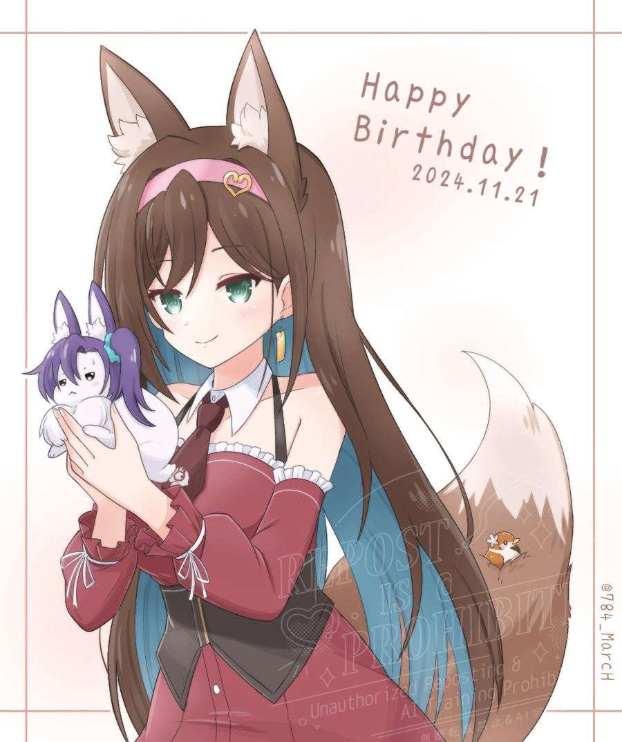 1girl :< animal animal_ears animalization aqua_hair aqua_scrunchie assault_lily asymmetrical_bangs bare_shoulders bird blush breasts brown_necktie closed_mouth collarbone colored_inner_hair commentary_request cowboy_shot day detached_collar dress earrings flower fox_ears fox_girl fox_tail frilled_dress frilled_sleeves frills gradient_background green_eyes hair_ornament hair_scrunchie hairband half-closed_eyes halter_dress halterneck hands_up happy_birthday heart heart_hair_ornament high_ponytail holding holding_animal honma_akehi inoguchi_minto inset_border ishizuka_fujino jewelry jitome kanba_girls_high_school_uniform kemonomimi_mode long_hair looking_ahead looking_at_viewer medium_breasts multicolored_hair navel necktie outside_border pink_background pink_hairband ponytail purple_hair rabbit ribbon school_uniform scrunchie shiozaki_suzume short_necktie side_ponytail single_earring sleeve_ribbon sleeveless sleeveless_dress smile solo sparrow standing tail twitter_username two-tone_background two-tone_hair underboob very_long_hair watermark white_background white_flower white_ribbon yellow_eyes