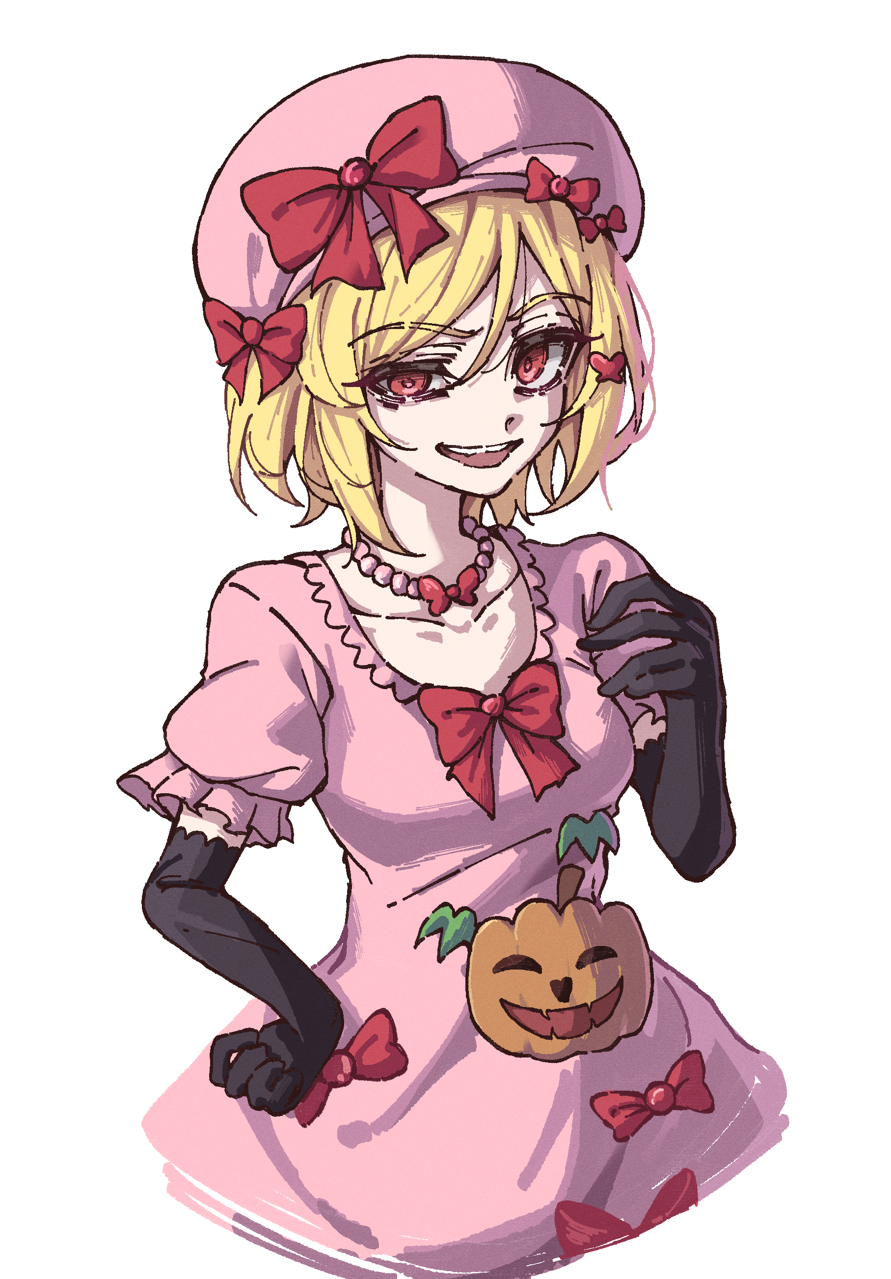 1girl absurdres beret black_gloves blonde_hair bow collarbone cowboy_shot dress elbow_gloves gloves hair_between_eyes hat highres jewelry lambdadelta looking_at_viewer necklace petra_(jgc845601) pink_dress red_bow red_eyes short_hair sidelocks simple_background smile solo teeth umineko_no_naku_koro_ni upper_teeth_only white_background