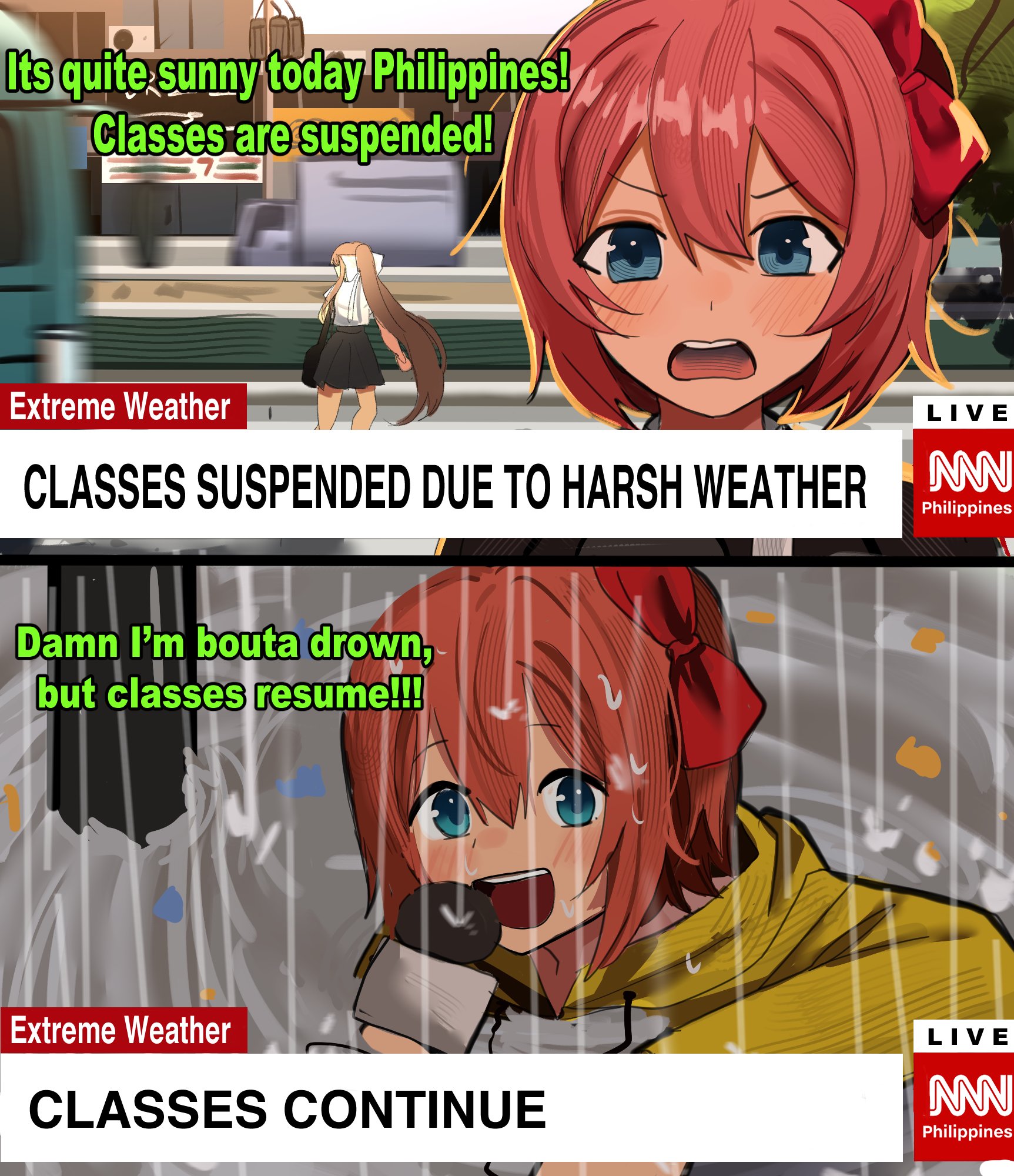 1girl 2koma comic doki_doki_literature_club english_text highres microphone monika_(doki_doki_literature_club) mykokampfwagen original rain raincoat sayori_(doki_doki_literature_club) short_hair
