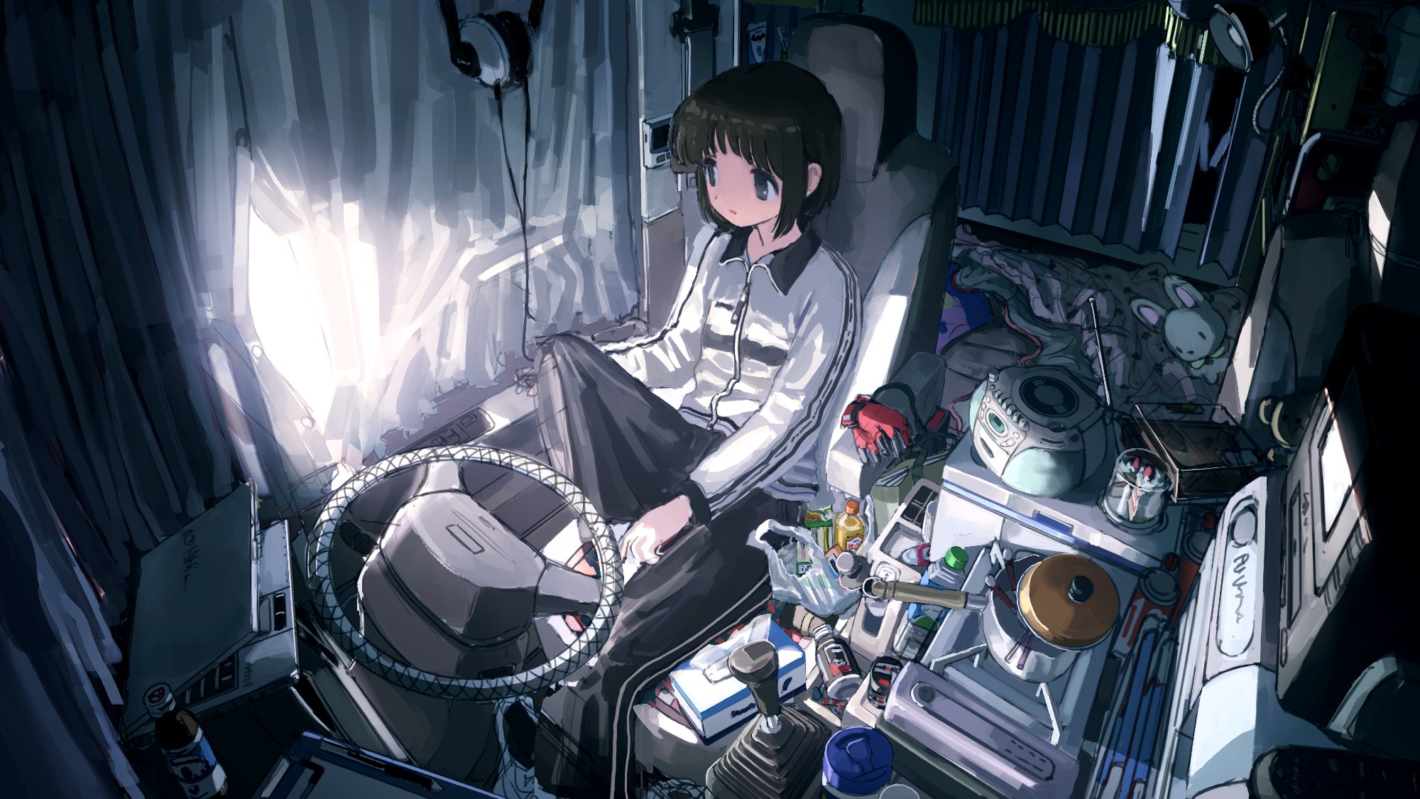 1girl anbiyori black_eyes brown_hair closed_mouth collared_jacket computer curtains headphones highres jacket knee_up laptop long_sleeves original radio short_hair sidelocks sitting slice_of_life solo steering_wheel tissue_box vehicle_interior white_jacket
