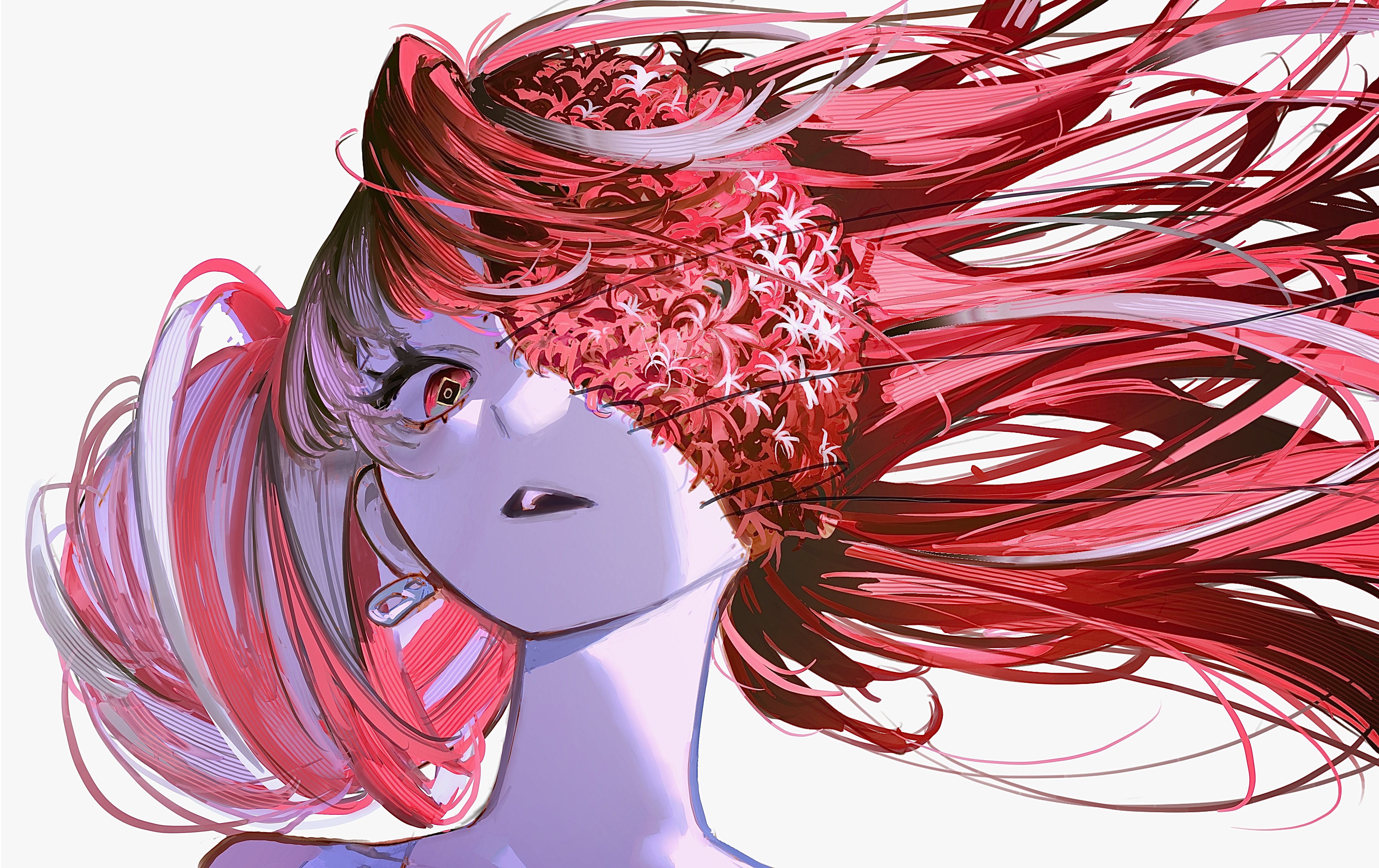 1girl absurdres body_horror double_bun earrings flower grey_hair hair_bun highres hololive hololive_indonesia inward_(itwasleo) jewelry kureiji_ollie long_hair looking_at_viewer multicolored_hair open_mouth portrait pungson_mori red_eyes red_flower red_hair simple_background single_earring solo spider_lily square_pupils streaked_hair teeth two-tone_hair upper_teeth_only virtual_youtuber white_background white_hair zombie