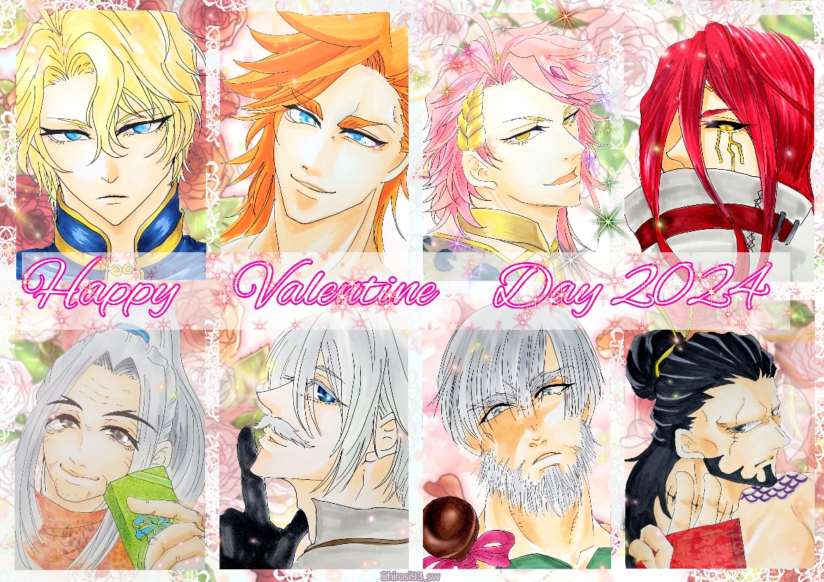 6+boys ancient_greek_clothes apollo_(shuumatsu_no_valkyrie) black_gloves black_hair black_sclera blonde_hair blue_eyes bow box brown_eyes candy cape cheek_tattoo chocolate closed_mouth collarbone collared_shirt colored_sclera covered_mouth dated diamond_(shape) diamond_hair_ornament expressionless facial_hair facial_scar floral_background food from_side gem gloves goatee goatee_stubble gold_choker gold_ribbon gold_tattoo gold_trim greco-roman_clothes grey_eyes grey_hair hair_between_eyes hair_down half-closed_eyes hand_up happy_valentine heracles_(shuumatsu_no_valkyrie) high_collar holding holding_box jack_the_ripper_(shuumatsu_no_valkyrie) jewelry jitome katana laurel_crown leonidas_(shuumatsu_no_valkyrie) lollipop long_hair looking_down looking_to_the_side lu_bu_(shuumatsu_no_valkyrie) male_focus mouth_covering multicolored_hair multiple_boys mustache old old_man open_mouth orange_cape orange_hair parted_lips pink_bow pink_gem pink_hair ponytail poseidon_(shuumatsu_no_valkyrie) red_hair sasaki_kojirou_(shuumatsu_no_valkyrie) scar scar_across_eye scar_on_cheek scar_on_face scar_on_neck scar_on_nose shirt short_hair shuumatsu_no_valkyrie sideways_glance smile spiked_hair stomach_tattoo stubble sword tattoo thor_(shuumatsu_no_valkyrie) toga topknot two-tone_hair upper_body v valentine weapon white_hair wrinkled_skin yellow_eyes