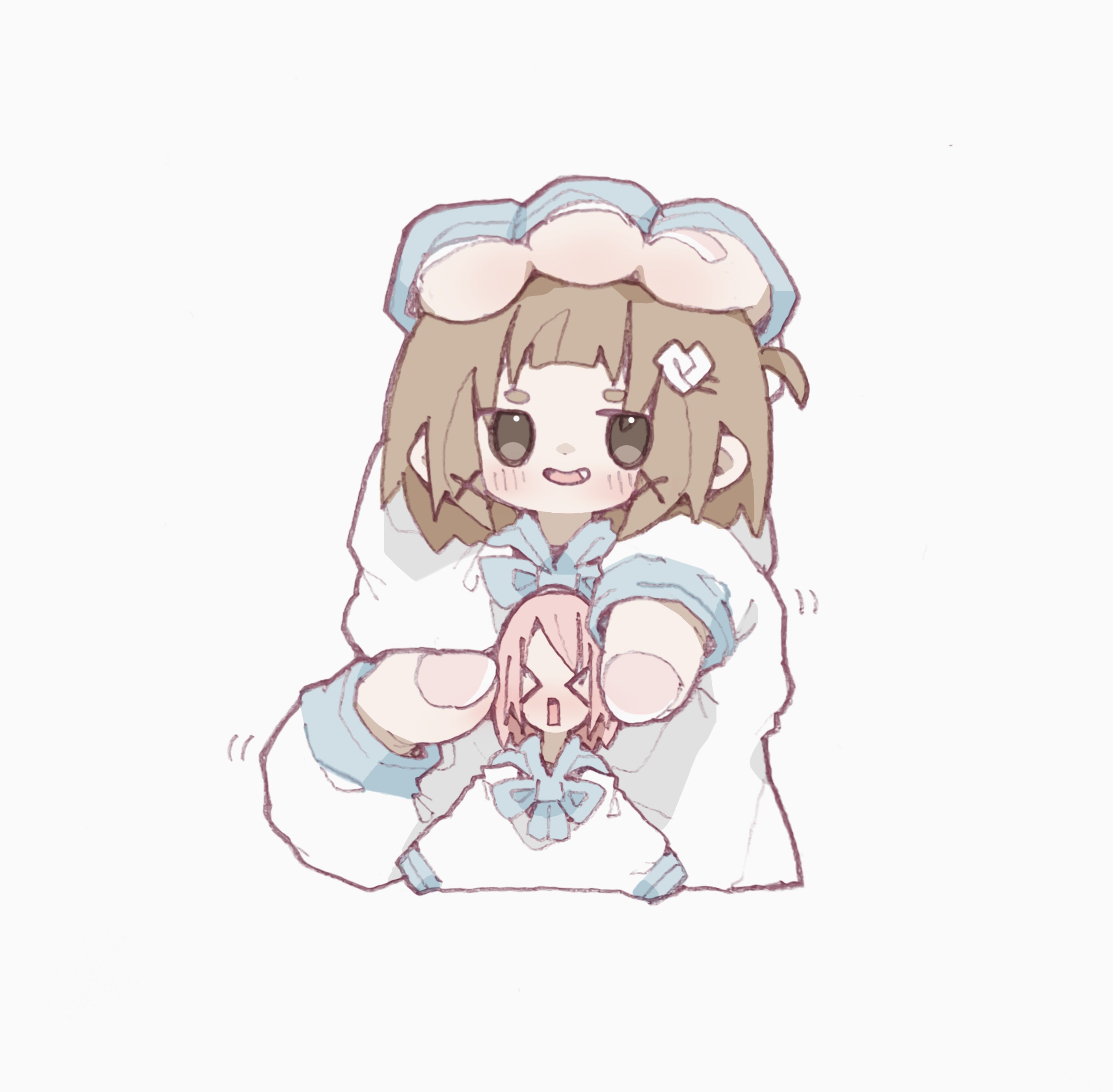 >_< 2girls absurdres bad_id bad_twitter_id blush bow bowtie brown_eyes brown_hair commentary_request cropped_torso extra_arms fang fingernails hair_ornament hairclip heart heart_hair_ornament highres long_sleeves looking_at_viewer medium_hair motion_lines multiple_girls nikamoka nose_blush open_mouth original panicking pink_hair simple_background size_difference smile squishing swept_bangs thick_eyebrows upper_body white_background x_hair_ornament