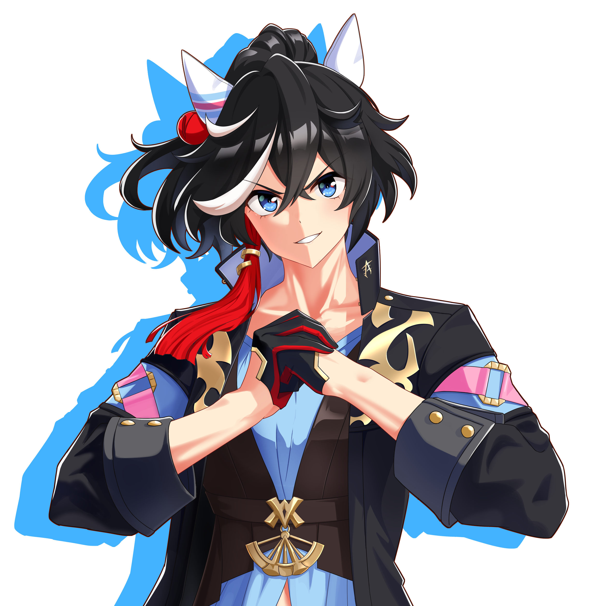 1girl absurdres animal_ears black_hair black_jacket blue_eyes blue_shirt blush breasts closed_mouth commentary_request dark_background ear_covers fist_in_hand hair_between_eyes hair_ornament highres horse_ears horse_girl jacket katsuragi_ace_(umamusume) looking_at_viewer medium_breasts medium_hair multicolored_hair senchan_7 shirt simple_background solo streaked_hair tassel tassel_hair_ornament umamusume upper_body white_background white_hair