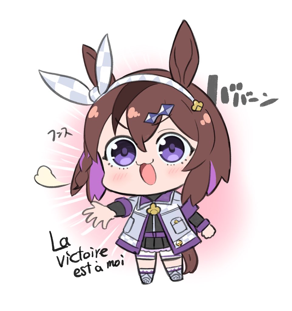 animal_ears belt blush breasts brown_hair chibi clenched_hand commentary_request do_deuce_(racehorse) french_text hair_between_eyes hair_ornament hairband horse_ears horse_girl jacket looking_at_viewer multicolored_hair open_mouth original purple_eyes simple_background two-tone_hair white_background yokoji_(kodai2015)