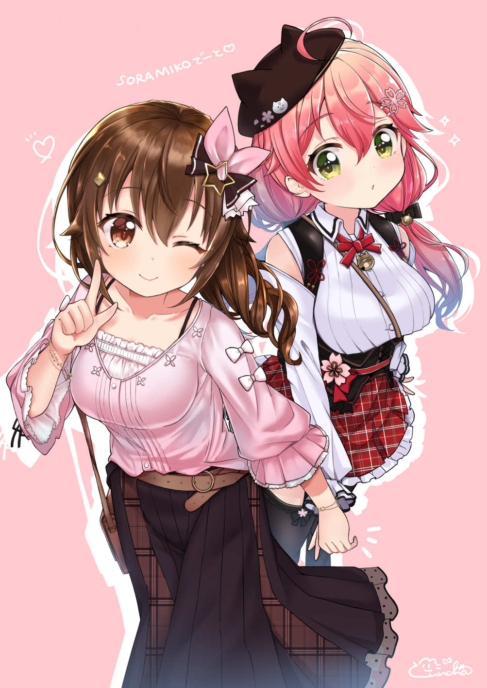 2girls :o ahoge bag belt beret black_hat black_thighhighs blush bodice bow bracelet breasts brown_belt brown_eyes brown_hair camisole clothing_cutout collarbone collared_shirt dress frilled_skirt frilled_sleeves frills green_eyes hair_between_eyes hair_flaps hair_ornament hair_ribbon hairclip hand_up handbag hat heart highres holding holding_bag holding_hands hololive jewelry large_breasts long_hair long_skirt long_sleeves looking_at_viewer low_twintails multiple_girls notice_lines official_alternate_costume pink_background pink_dress pink_hair pink_ribbon plaid_clothes plaid_skirt pleated_skirt ponytail red_skirt ribbon sakura_miko sakura_miko_(casual) shirt shoulder_cutout side_ponytail signature simple_background skirt three-quarter_sleeves smile star_(symbol) star_hair_ornament thighhighs tokino_sora tokino_sora_(casual) twintails virtual_youtuber wavy_hair white_bow white_shirt yuncha