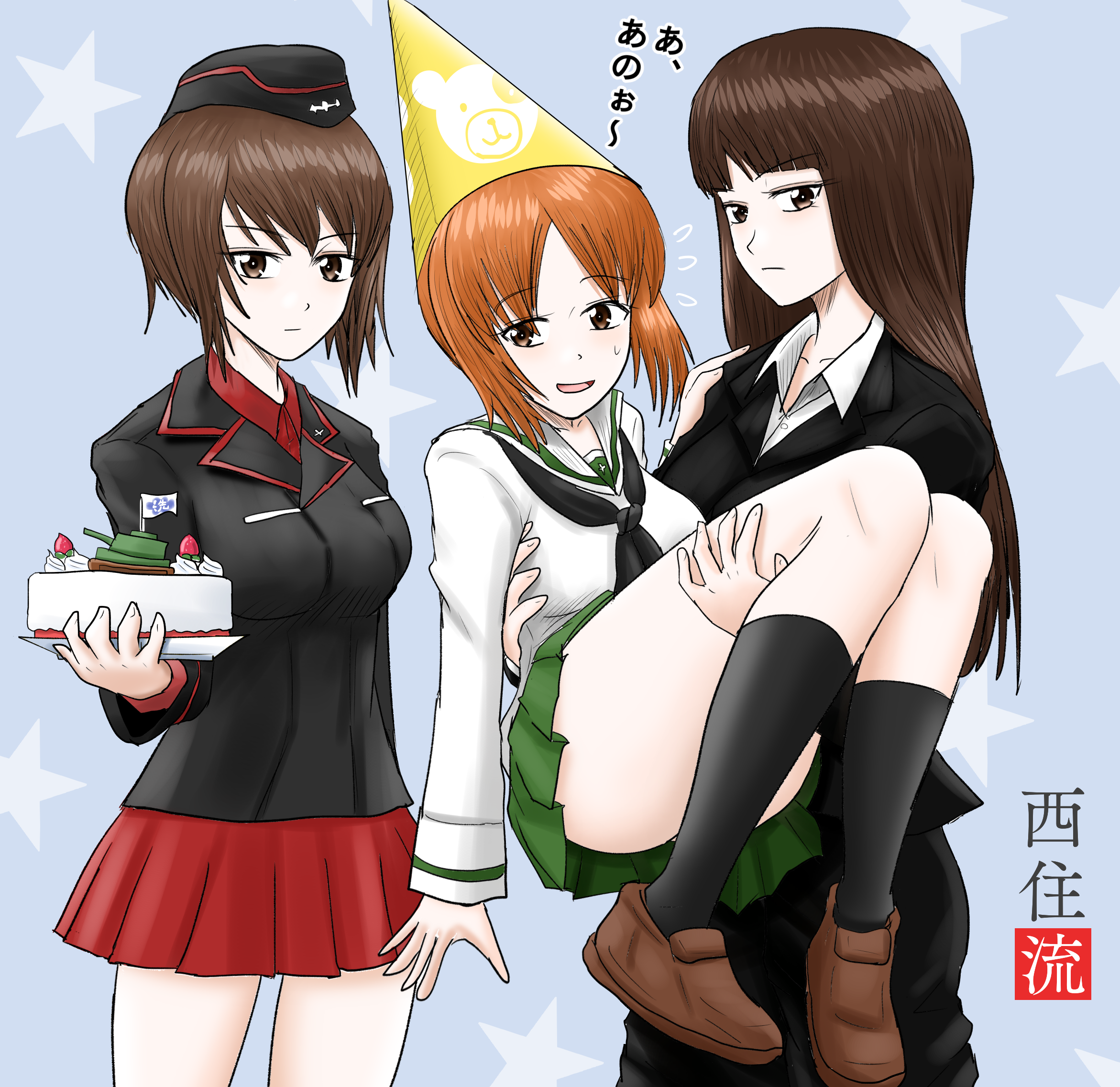 3girls aged_down artist_name birthday birthday_cap black_jacket black_neckerchief black_socks blouse blunt_bangs blush brown_eyes brown_footwear brown_hair cake carrying closed_mouth cross dress_shirt embarrassed emblem family food formal_clothes frown garrison_cap girls_und_panzer green_skirt happy_birthday harukai-i hat highres holding holding_cake holding_food jacket kuromorimine_military_uniform long_hair looking_at_viewer mature_eyes mature_female military military_hat military_uniform miniskirt mother_and_child mother_and_daughter multiple_girls neckerchief nishizumi_maho nishizumi_miho nishizumi_shiho ooarai_(emblem) ooarai_school_uniform open_mouth pant_suit pants parent_and_child princess_carry red_shirt red_skirt sailor_collar school_uniform serafuku shirt siblings sisters skirt socks straight_hair suit translation_request white_sailor_collar white_shirt wing_collar yellow_hat