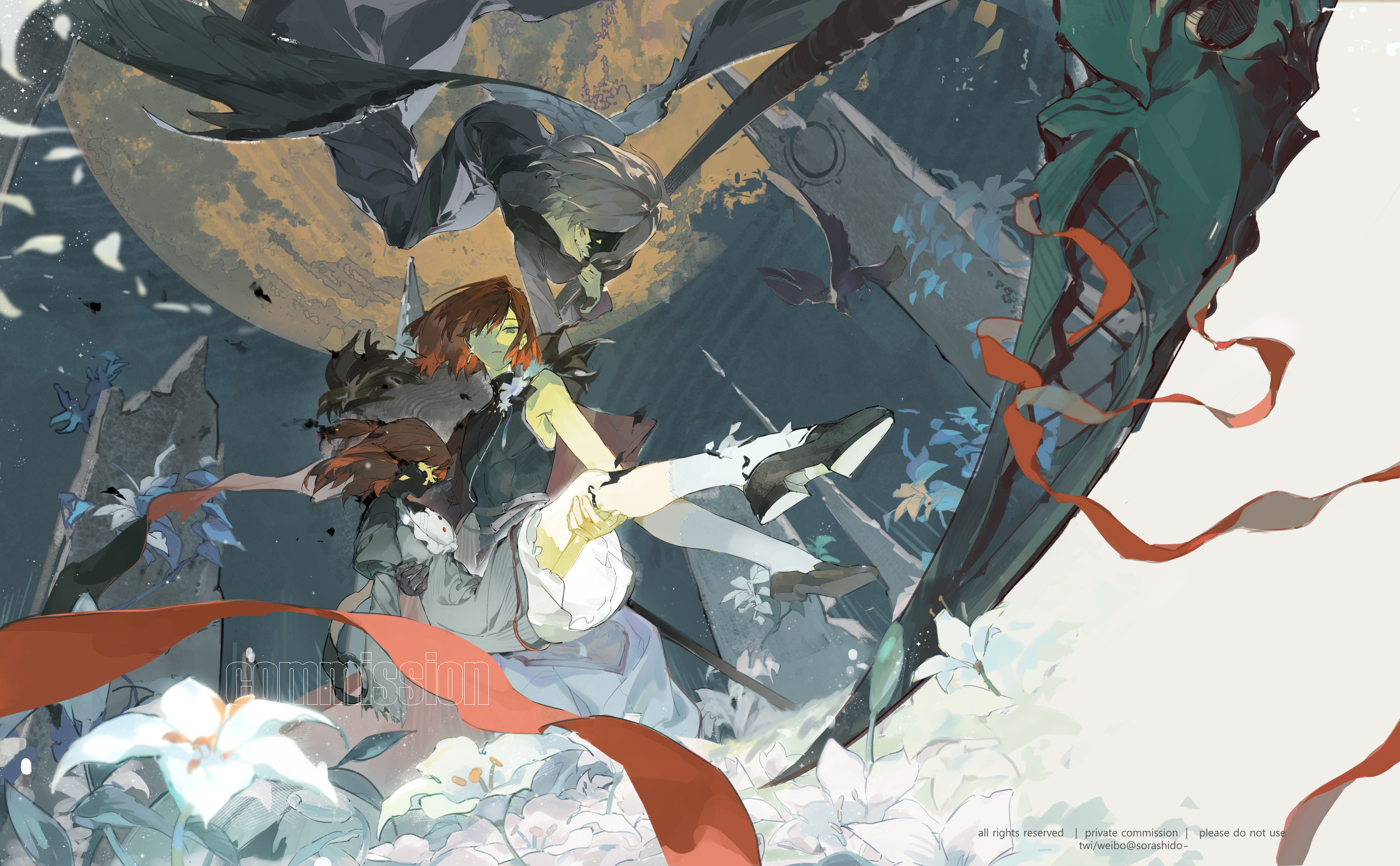 1boy 2girls absurdres black_dress carrying copyright_request dress flower green_eyes grey_dress highres lily_(flower) moon multiple_girls night outdoors princess_carry red_hair sky sorashido