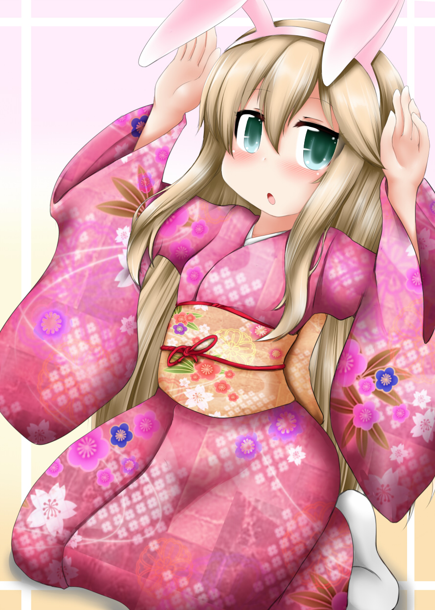 1girl animal_ears blonde_hair commentary_request fake_animal_ears floral_print full_body green_eyes highres japanese_clothes kimono long_hair obi open_mouth original ouno_(nounai_disintegration) pink_kimono rabbit_pose sash seiza sitting socks solo white_socks