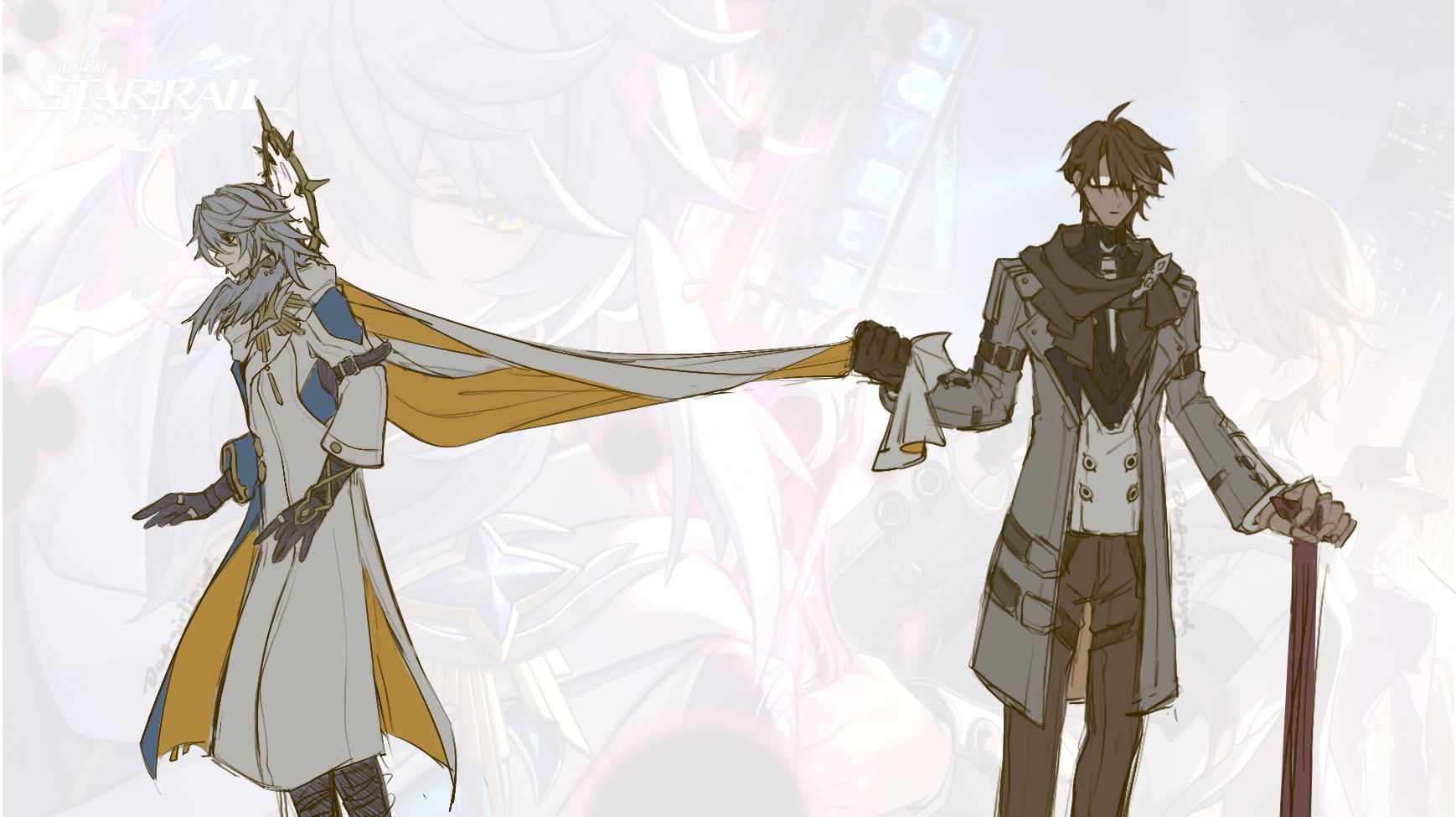 2boys brown_hair brown_scarf cane cape cape_grab catgirljoseph clothes_grab coat cowboy_shot glasses grey_coat grey_hair grey_pants halo head_wings highres holding holding_cane honkai:_star_rail honkai_(series) long_sleeves medium_hair multiple_boys pants scarf scene_reference sunday_(honkai:_star_rail) superman/batman:_apocalypse vest welt_yang white_cape white_coat white_vest wings