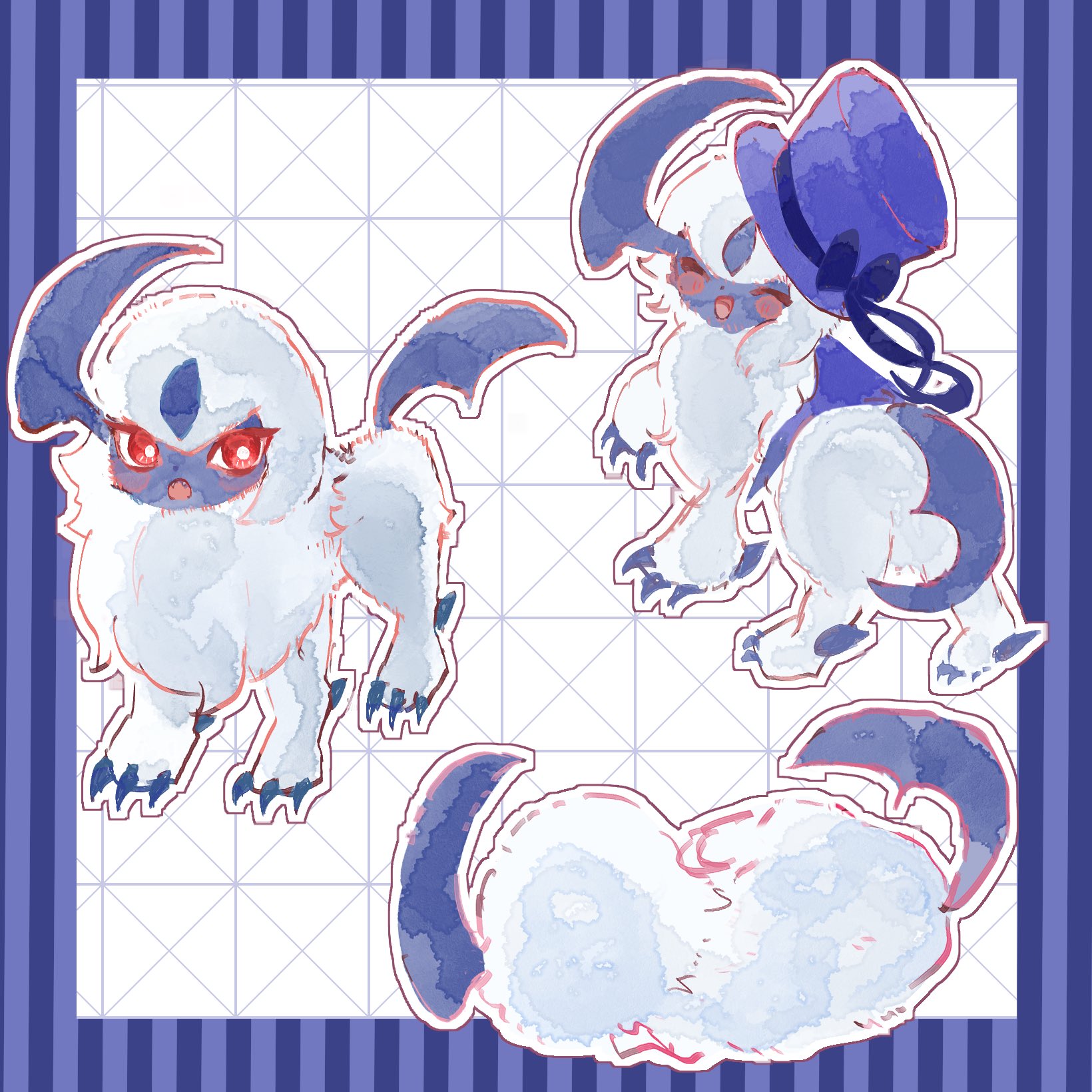 absol animal_focus blue_bow blue_ribbon bow bright_pupils claws fangs gen_3_pokemon hat highres horns kako_xox lying nintendo no_humans on_side open_mouth pokemon pokemon_(creature) red_eyes ribbon single_horn top_hat white_hair white_pupils